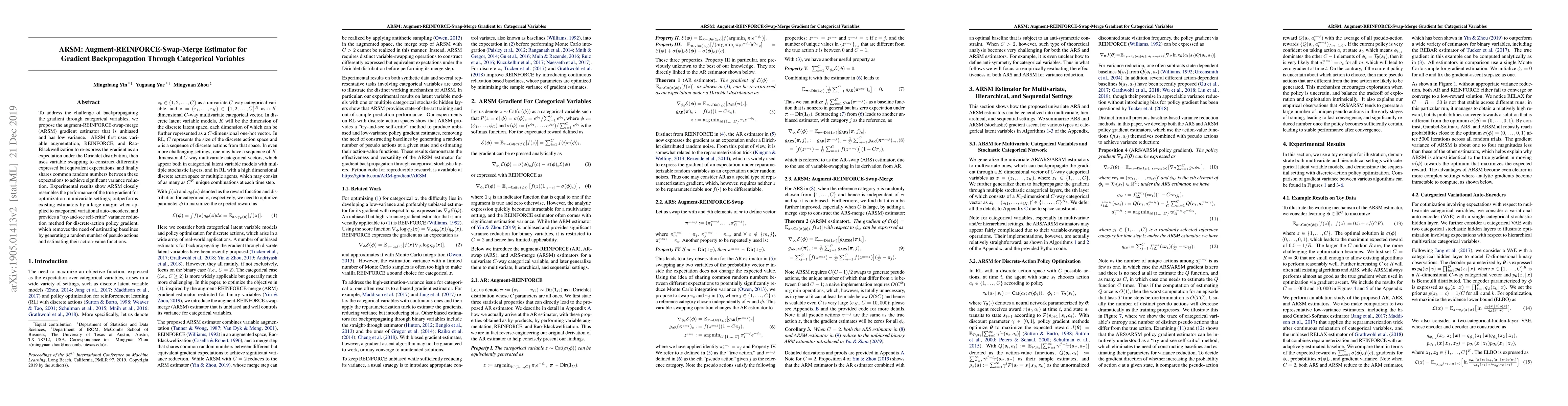 The ARSM estimator addresses gradient backpropagation through categorical variables by combining variable augmentation, REINFORCE, and Rao-Blackwellization for low-variance gradient estimation, outperforming existing methods in categorical variational auto-encoders and discrete-action policy gradient optimization.