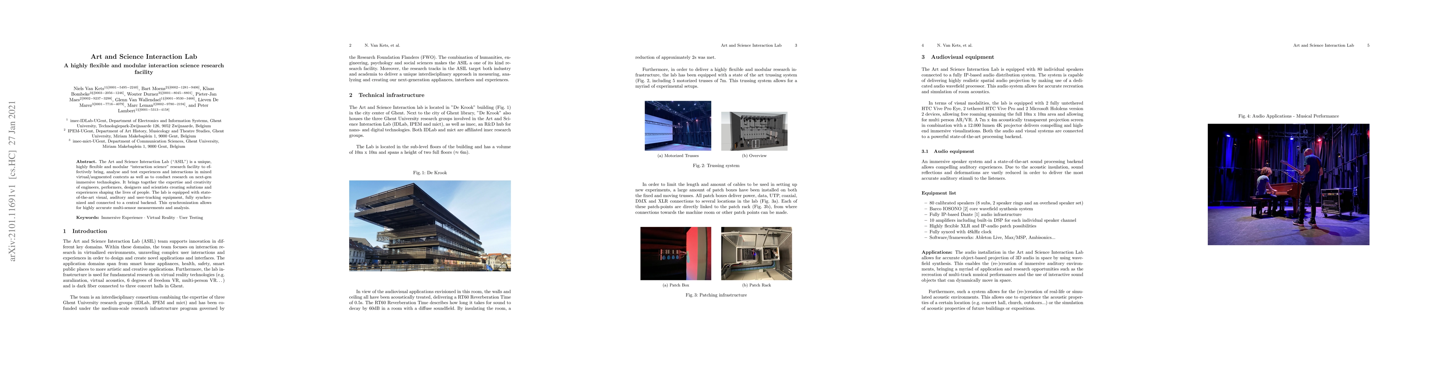The Art and Science Interaction Lab (ASIL) is a unique, highly flexible and modular interaction science research facility to effectively bring, analyse and test experiences and interactions in mixed virtual/augmented contexts as well as to conduct research on next-gen immersive technologies. It brings together the expertise and creativity of engineers, performers, designers and scientists creating solutions and experiences shaping the lives of people. The lab is equipped with state-of-the-art visual, auditory and user-tracking equipment, fully synchronized and connected to a central backend. This synchronization allows for highly accurate multi-sensor measurements and analysis.