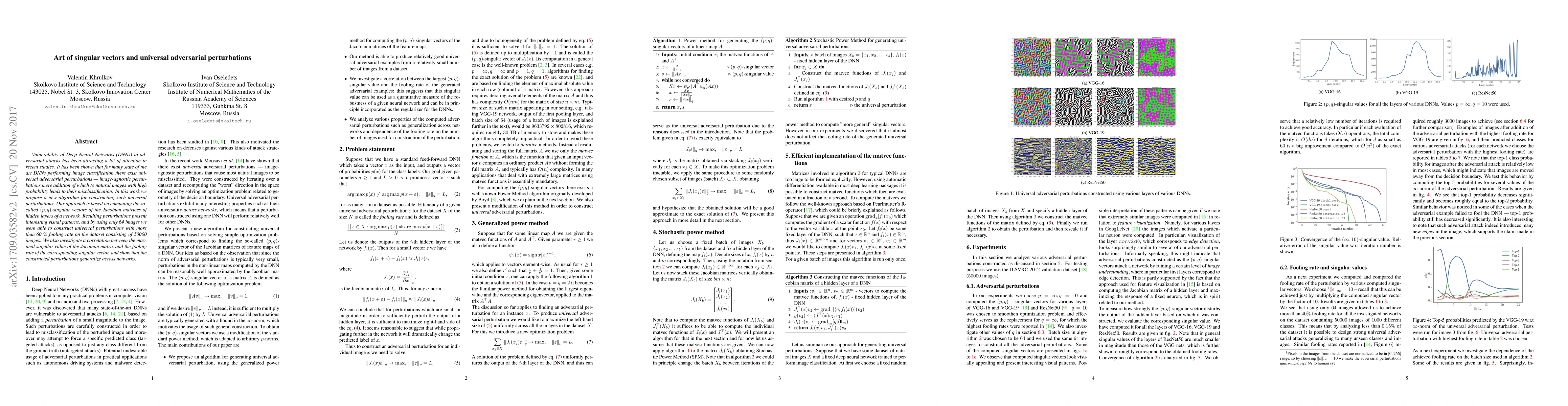 This paper proposes a new algorithm to construct universal adversarial perturbations for Deep Neural Networks (DNNs) by computing $(p, q)$-singular vectors of Jacobian matrices. The resulting perturbations achieve over 60% fooling rate on a dataset of 50,000 images, demonstrating their effectiveness across different networks.