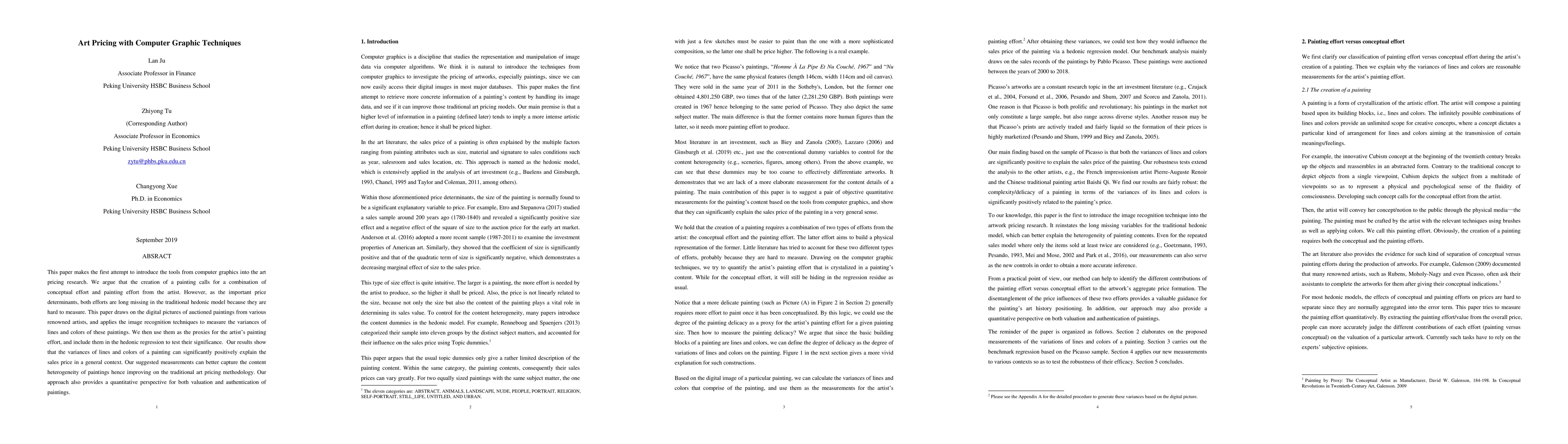 This paper makes the first attempt to introduce the tools from computer graphics into the art pricing research. We argue that the creation of a painting calls for a combination of conceptual effort and painting effort from the artist. However, as the important price determinants, both efforts are long missing in the traditional hedonic model because they are hard to measure. This paper draws on the digital pictures of auctioned paintings from various renowned artists, and applies the image recognition techniques to measure the variances of lines and colors of these paintings. We then use them as the proxies for the artist's painting effort, and include them in the hedonic regression to test their significance. Our results show that the variances of lines and colors of a painting can significantly positively explain the sales price in a general context. Our suggested measurements can better capture the content heterogeneity of paintings hence improving on the traditional art pricing methodology. Our approach also provides a quantitative perspective for both valuation and authentication of paintings.