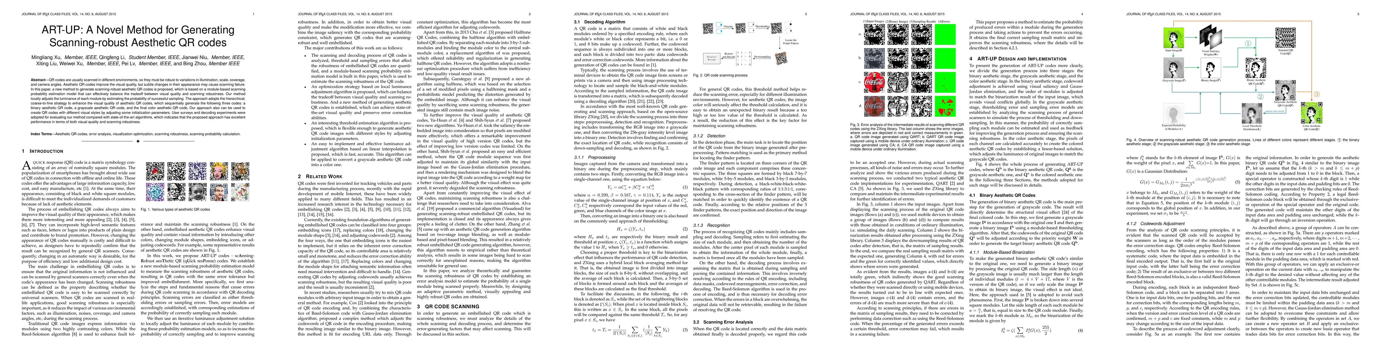 This paper introduces ART-UP, a novel method for generating aesthetically pleasing QR codes that maintain scanning robustness across various environmental conditions. The method balances visual quality and scanning reliability through a module-based scanning probability estimation model, employing a hierarchical, coarse-to-fine strategy to adjust module luminance and generate binary, grayscale, and color aesthetic QR codes.