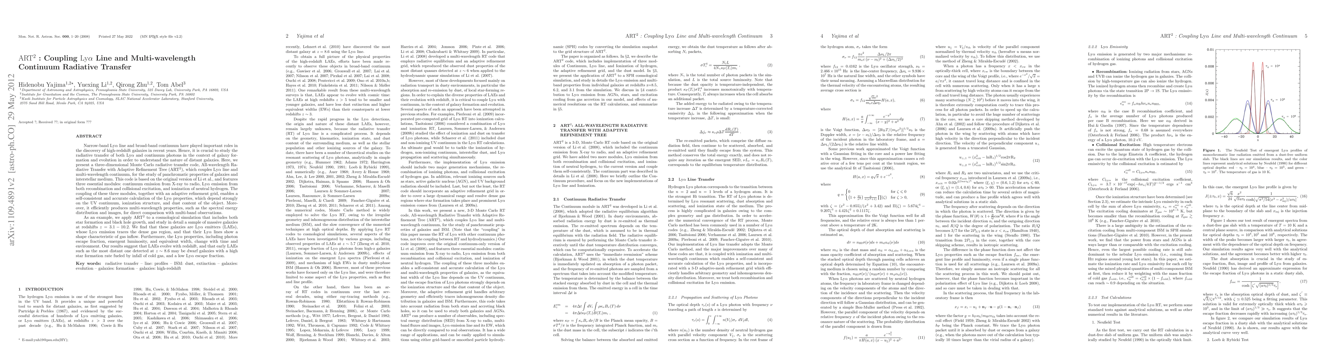 The paper introduces ART^2, a three-dimensional Monte Carlo radiative transfer code that couples Lyman-alpha line and multi-wavelength continuum for studying galaxy formation and evolution. The code reveals that high-redshift Lya emitters (LAEs) trace dense gas regions and exhibit gas inflow characteristics, suggesting LAEs evolve with redshift and early LAEs may be dwarf galaxies with high star formation rates.