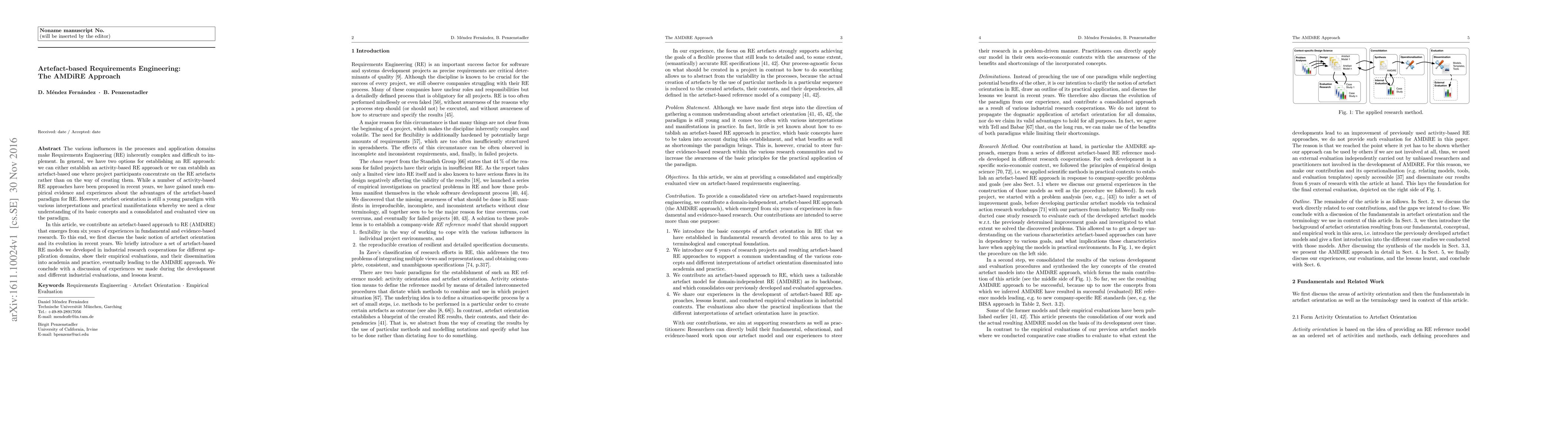 This paper introduces the AMDiRE approach, an artefact-based Requirements Engineering (RE) methodology developed over six years of research. It emphasizes the importance of focusing on RE artefacts rather than the processes, providing empirical evidence and evaluations of various artefact-based RE models across different domains.