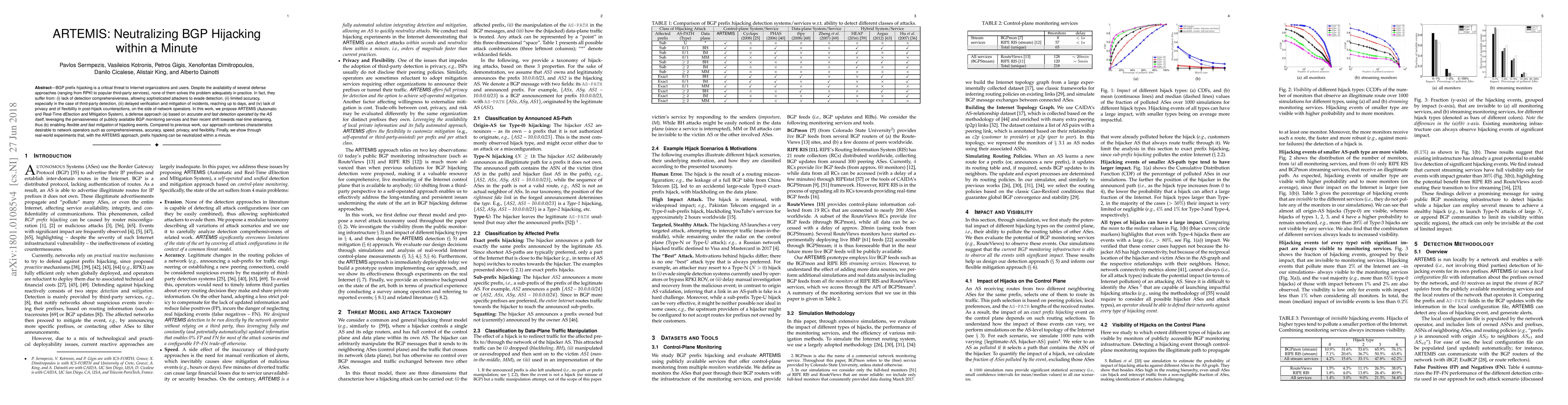 ARTEMIS is a novel defense system designed to detect and mitigate BGP prefix hijacking in real-time, achieving neutralization within a minute. It addresses existing shortcomings in detection comprehensiveness, accuracy, and response speed, offering network operators enhanced privacy and flexibility.