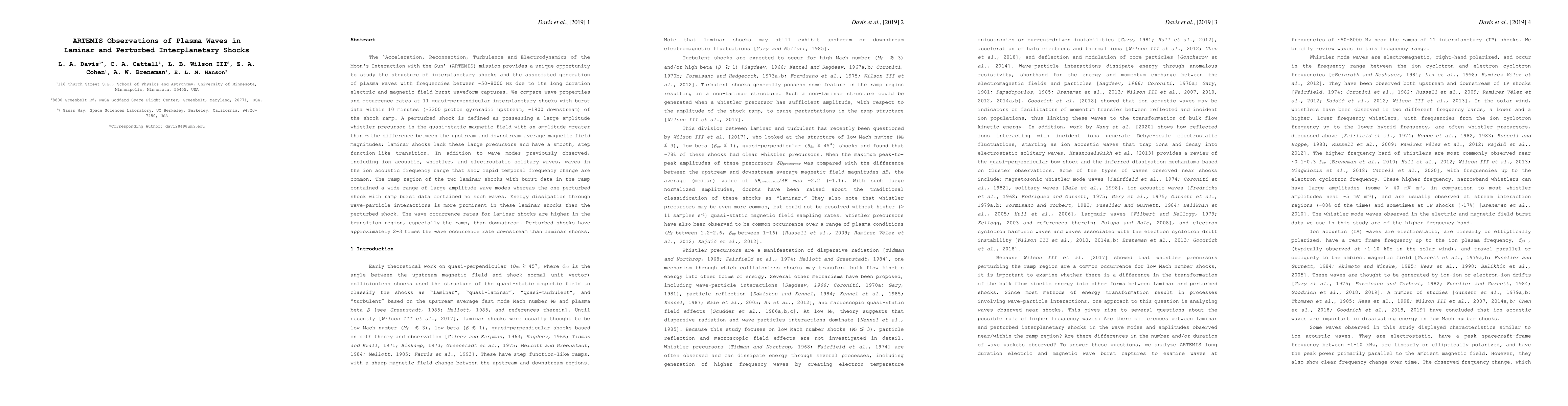 The ARTEMIS mission investigates plasma waves in interplanetary shocks, revealing that laminar shocks exhibit higher wave occurrence rates and more energy dissipation through wave-particle interactions compared to perturbed shocks, which show fewer waves in the ramp region and higher downstream rates.