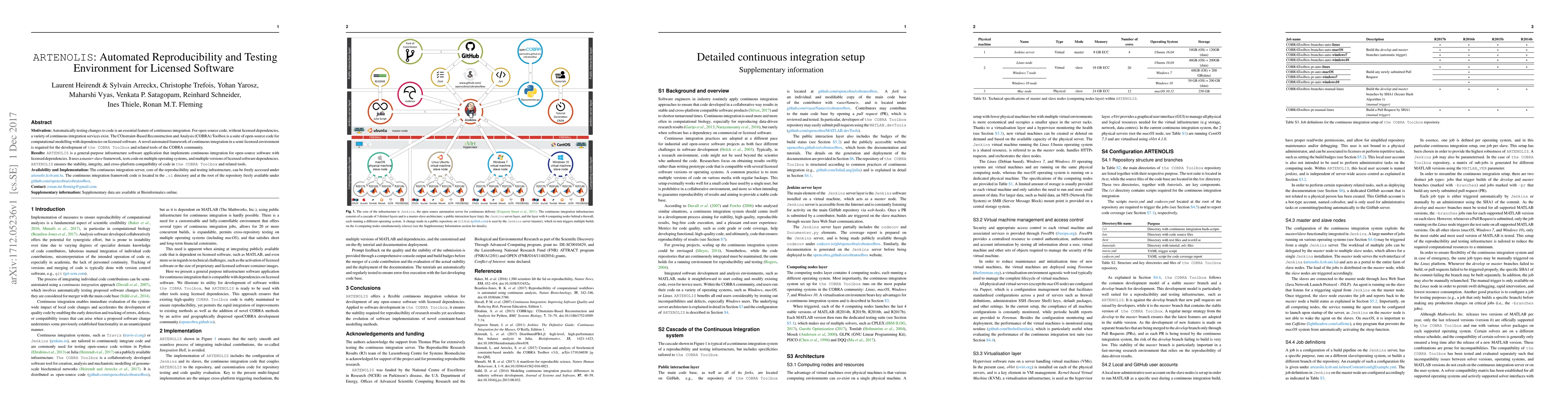 ARTENOLIS automates continuous integration for open-source software with licensed dependencies, ensuring stability and cross-platform compatibility. The framework is publicly accessible and supports testing on multiple operating systems and software versions.