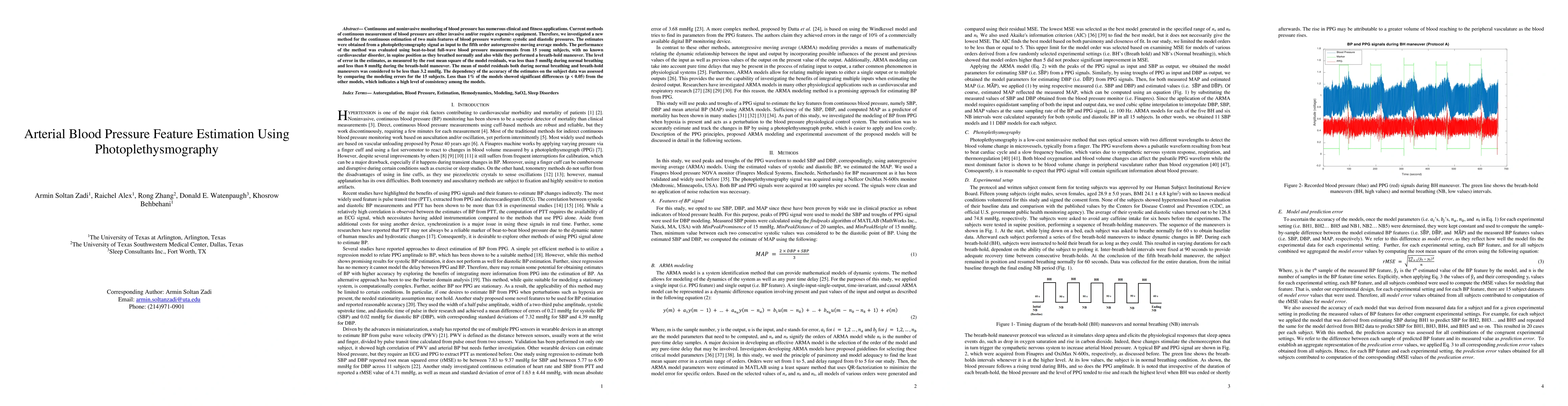 This study introduces a noninvasive method for continuous blood pressure estimation using photoplethysmography and autoregressive models, achieving an error of less than 5 mmHg during normal breathing and less than 8 mmHg during breath-hold maneuvers, demonstrating high consistency across 15 subjects.