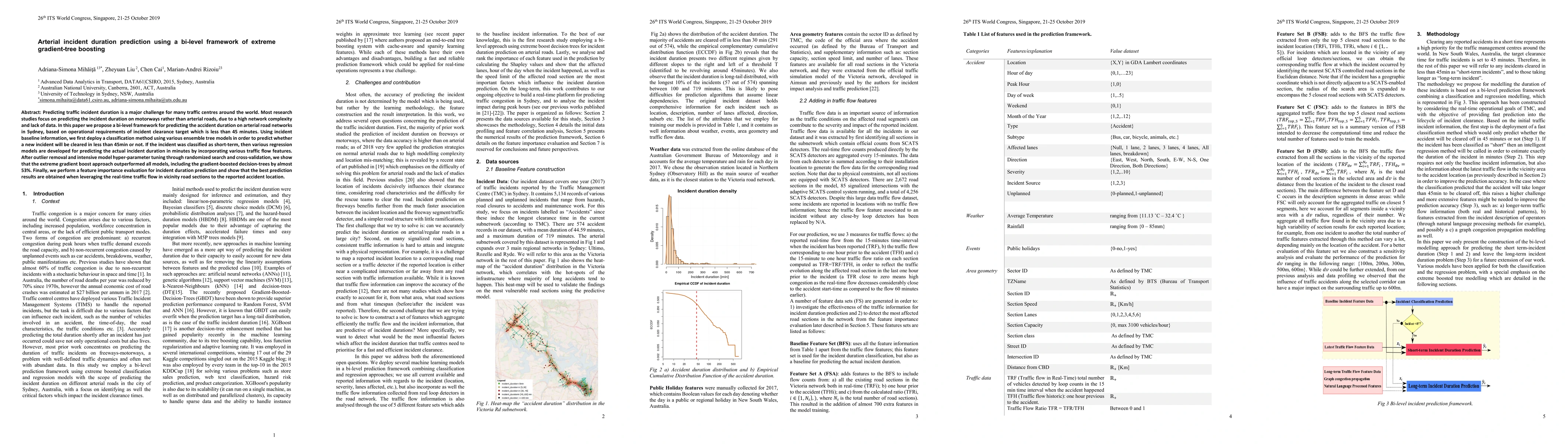This paper proposes a bi-level framework using extreme gradient-tree boosting to predict the duration of arterial road incidents in Sydney, focusing on clearance targets under 45 minutes. The framework first classifies incidents as short-term or not, then applies regression models for duration prediction, achieving superior performance over other methods.
