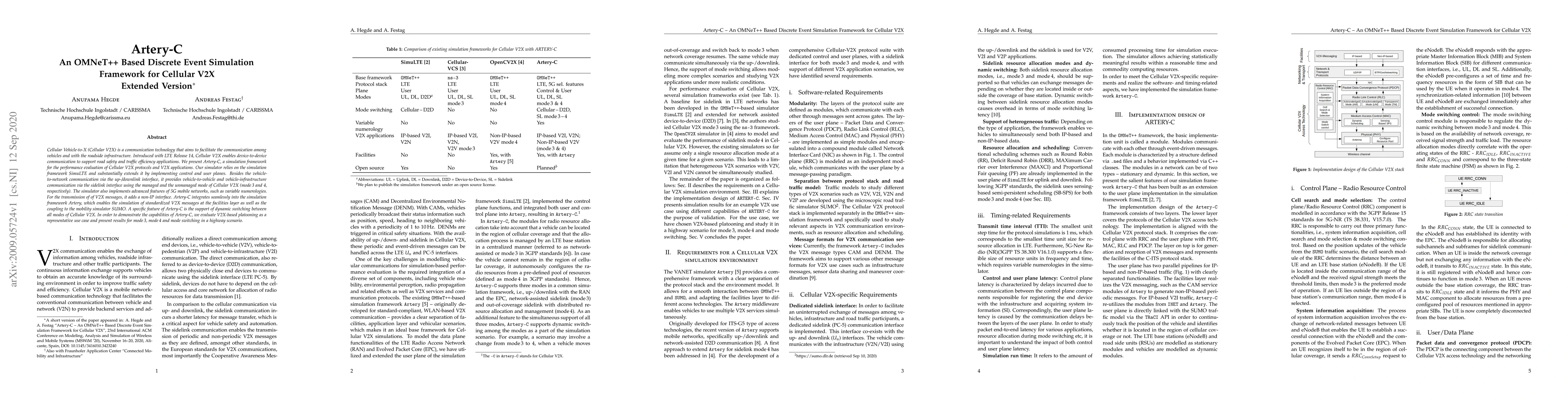 Artery-C is a simulation framework based on OMNeT++ for evaluating Cellular V2X protocols, supporting vehicle-to-network and vehicle-to-vehicle communication via LTE and 5G features. It demonstrates V2X-based platooning performance in highway scenarios, showcasing dynamic switching between Cellular V2X modes.