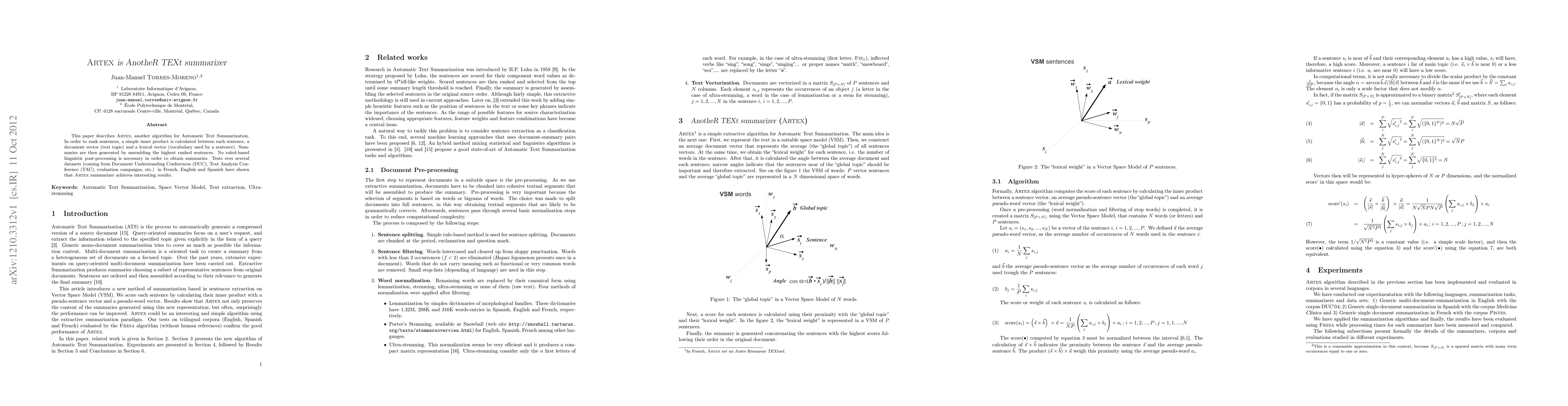 This paper describes Artex, another algorithm for Automatic Text Summarization. In order to rank sentences, a simple inner product is calculated between each sentence, a document vector (text topic) and a lexical vector (vocabulary used by a sentence). Summaries are then generated by assembling the highest ranked sentences. No ruled-based linguistic post-processing is necessary in order to obtain summaries. Tests over several datasets (coming from Document Understanding Conferences (DUC), Text Analysis Conferences (TAC), evaluation campaigns, etc.) in French, English and Spanish have shown that summarizer achieves interesting results.