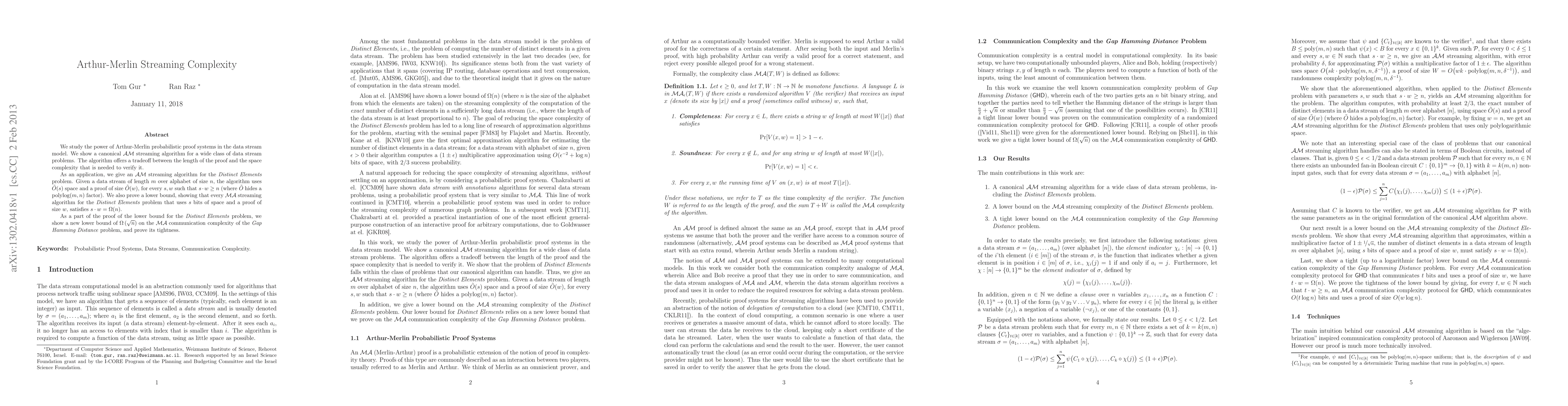 This paper explores the application of Arthur-Merlin proof systems in the data stream model, presenting an $\mathcal{AM}$ streaming algorithm for the Distinct Elements problem with a space-proof size tradeoff. It also establishes a lower bound showing that any $\mathcal{MA}$ algorithm for the same problem must satisfy $s \cdot w = \Omega(n)$.