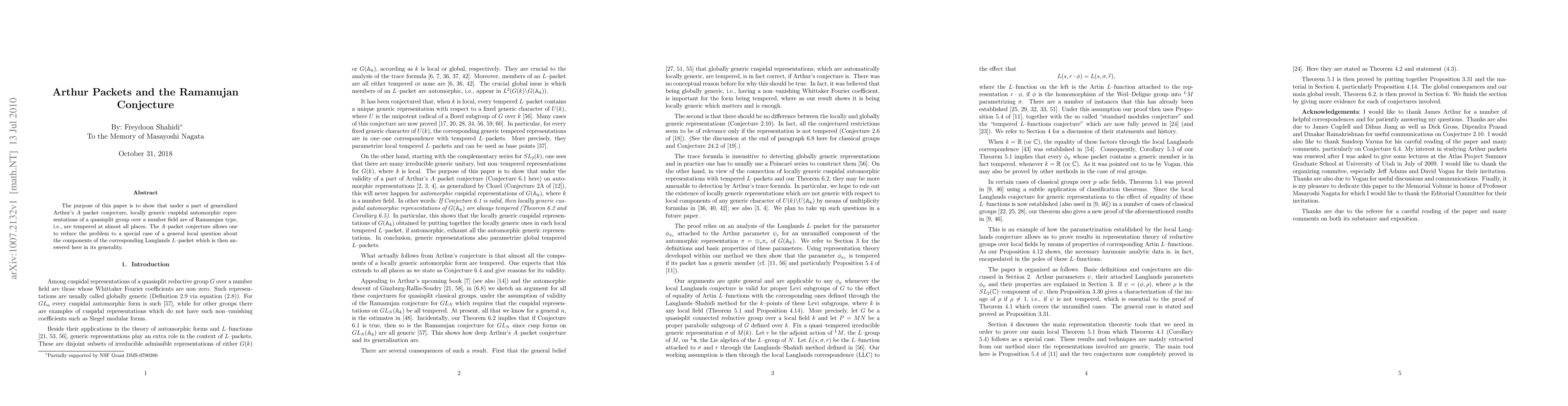 The paper employs Arthur's A-packet conjecture, generalized by Clozel, to analyze cuspidal automorphic representations of reductive algebraic groups over number fields, reducing the problem to local questions about components of Langlands L-packets.
