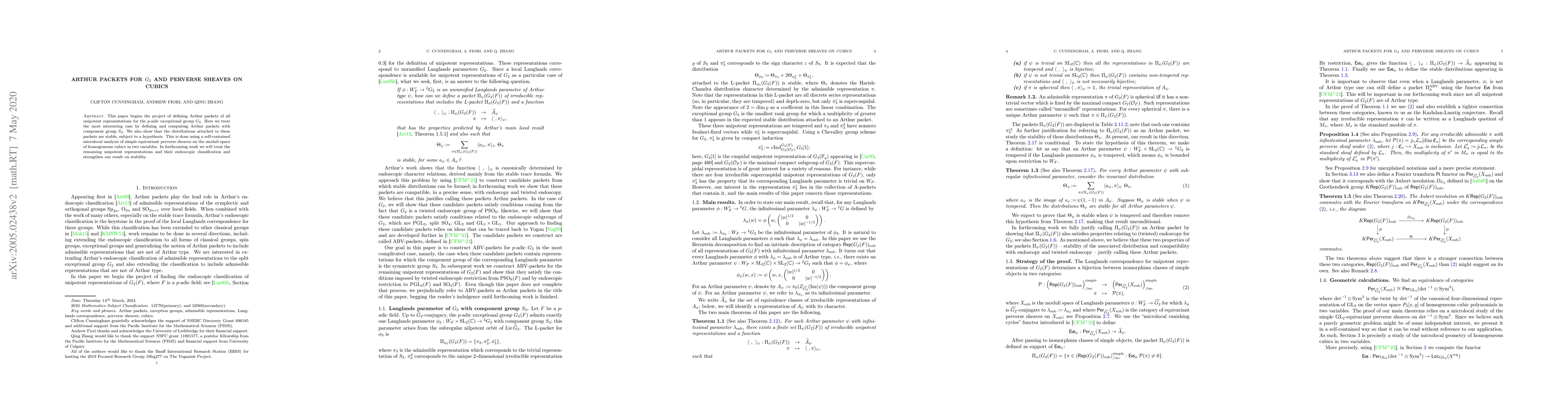 This paper defines Arthur packets for unipotent representations of the $p$-adic exceptional group $G_2$ with component group $S_3$, employing microlocal analysis of equivariant perverse sheaves on cubics, and proves their stability under a hypothesis. Further work will cover the remaining unipotent representations and enhance the stability result.