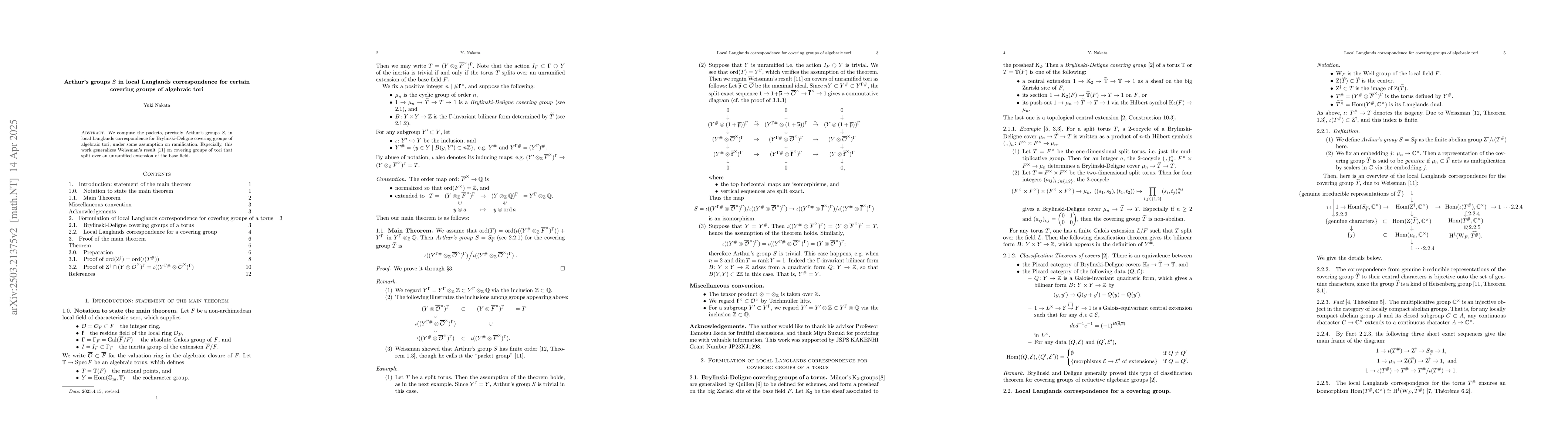 The paper computes Arthur's groups $S$ in the local Langlands correspondence for Brylinski-Deligne covering groups of algebraic tori, utilizing Galois cohomology and classifying covers via Picard categories.