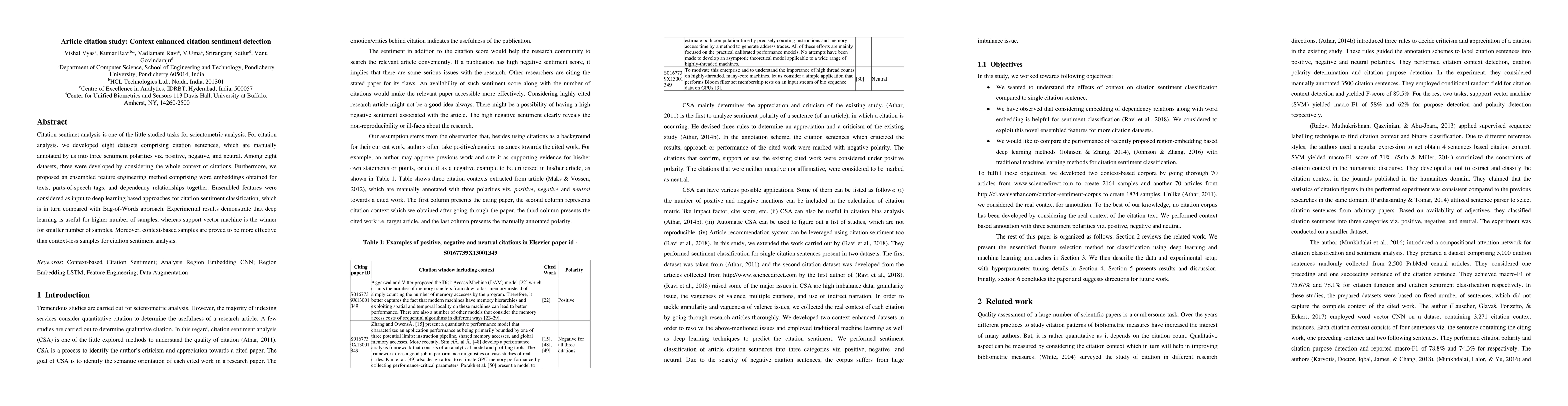 This paper develops eight annotated datasets for citation sentiment analysis, distinguishing between positive, negative, and neutral sentiments. An ensembled feature engineering method combining word embeddings, POS tags, and dependency relationships is proposed, showing that deep learning methods outperform Bag-of-Words for larger datasets, while SVM works better for smaller ones, with context-based datasets proving more effective.