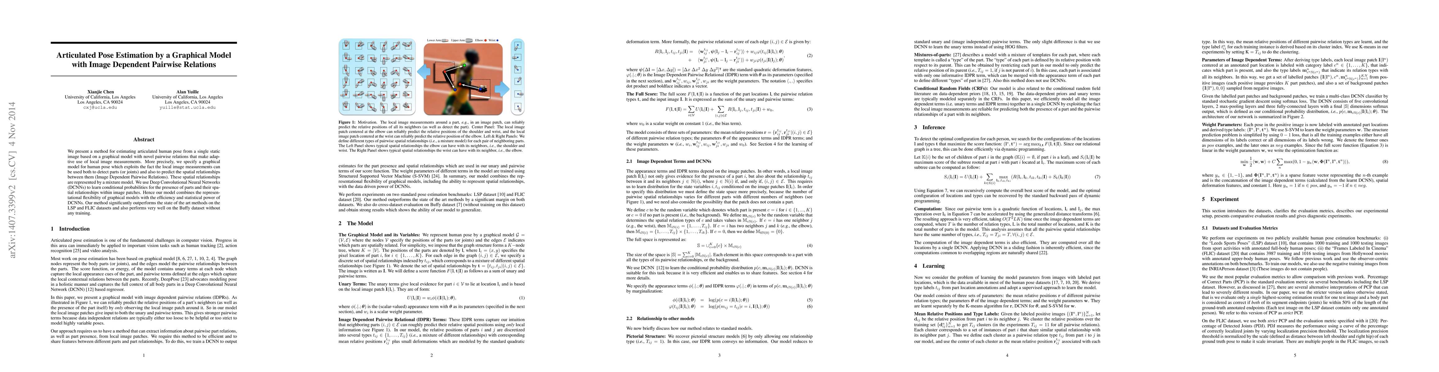 We present a method for estimating articulated human pose from a single static image based on a graphical model with novel pairwise relations that make adaptive use of local image measurements. More precisely, we specify a graphical model for human pose which exploits the fact the local image measurements can be used both to detect parts (or joints) and also to predict the spatial relationships between them (Image Dependent Pairwise Relations). These spatial relationships are represented by a mixture model. We use Deep Convolutional Neural Networks (DCNNs) to learn conditional probabilities for the presence of parts and their spatial relationships within image patches. Hence our model combines the representational flexibility of graphical models with the efficiency and statistical power of DCNNs. Our method significantly outperforms the state of the art methods on the LSP and FLIC datasets and also performs very well on the Buffy dataset without any training.