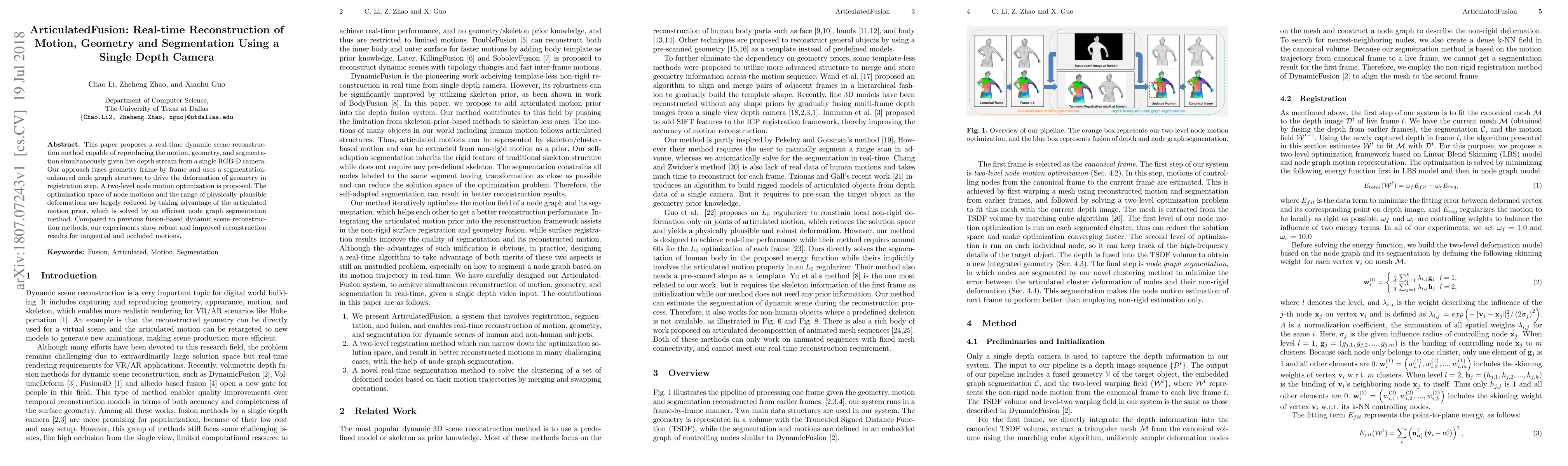 This paper introduces ArticulatedFusion, a method for real-time dynamic scene reconstruction using a single depth camera, achieving simultaneous motion, geometry, and segmentation reconstruction. It employs a segmentation-enhanced node graph and articulated motion priors for efficient optimization, demonstrating robust results for tangential and occluded motions.