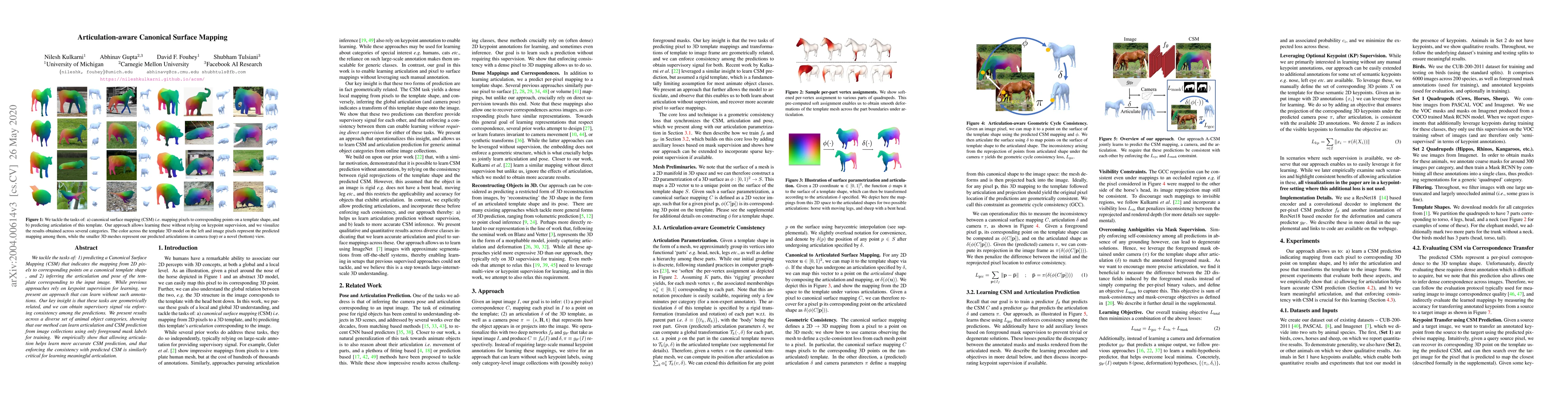 This paper proposes a method to predict Canonical Surface Mappings and infer articulation and pose without keypoint annotations, leveraging geometric consistency between predictions for training. Results demonstrate improved CSM accuracy and meaningful articulation learning using only foreground mask labels.