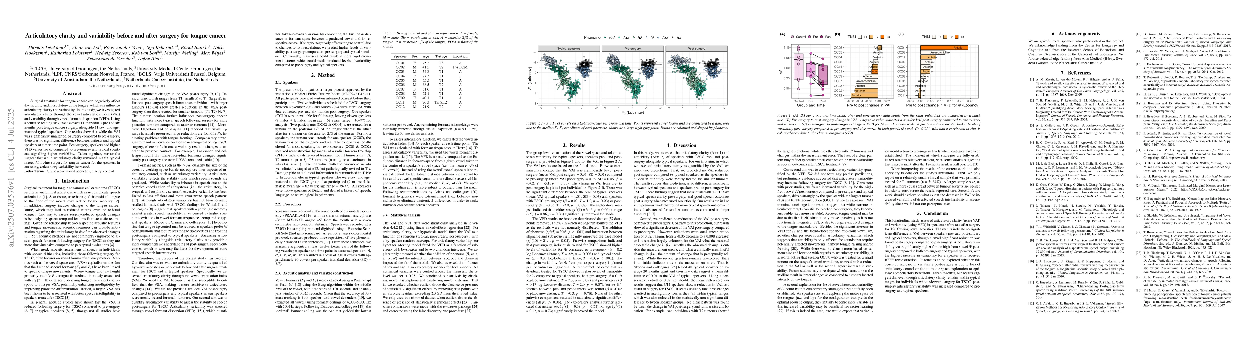 Surgical treatment for tongue cancer can negatively affect the mobility and musculature of the tongue, which can influence articulatory clarity and variability. In this study, we investigated articulatory clarity through the vowel articulation index (VAI) and variability through vowel formant dispersion (VFD). Using a sentence reading task, we assessed 11 individuals pre and six months post tongue cancer surgery, alongside 11 sex- and age matched typical speakers. Our results show that while the VAI was significantly smaller post-surgery compared to pre-surgery, there was no significant difference between patients and typical speakers at either time point. Post-surgery, speakers had higher VFD values for /i/ compared to pre-surgery and typical speakers, signalling higher variability. Taken together, our results suggest that while articulatory clarity remained within typical ranges following surgery for tongue cancer for the speakers in our study, articulatory variability increased.