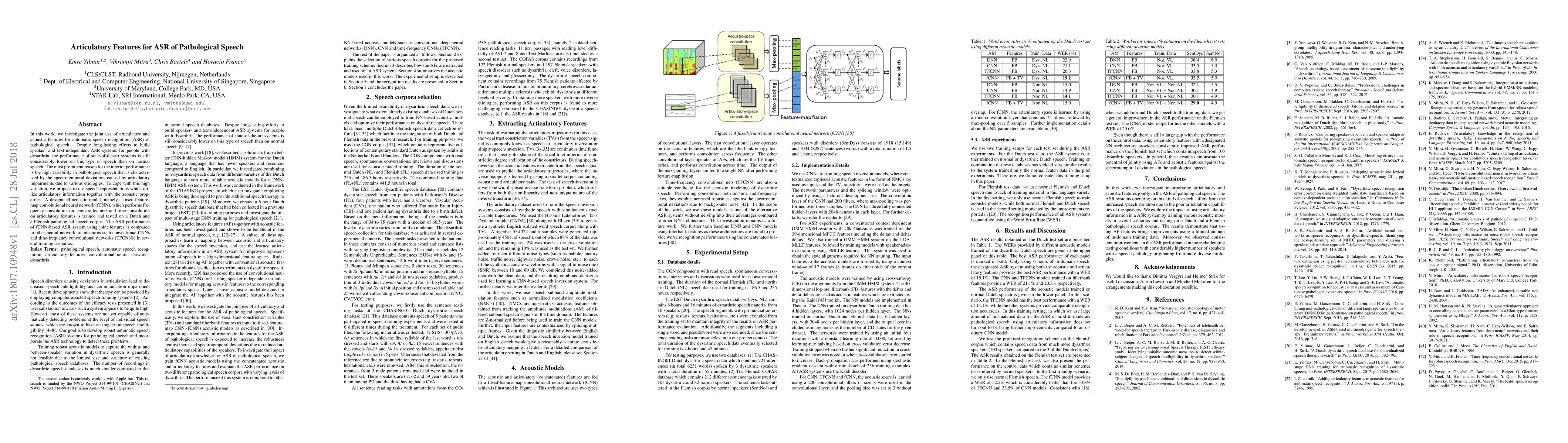 The proposed fCNN architecture that fuses acoustic and articulatory features for ASR of pathological speech, demonstrating improved performance over conventional CNN and TFCNN models.