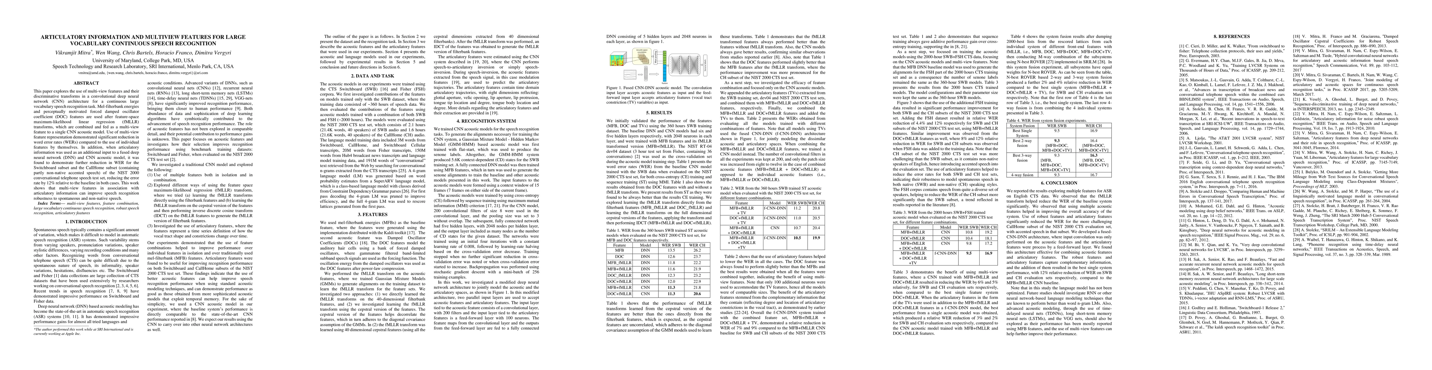 This research demonstrates that using multi-view features, including Mel-filterbank energies and DOC features with fMLLR transforms, within a CNN architecture significantly reduces word error rates in large vocabulary continuous speech recognition. Additionally, incorporating articulatory information into a fused DNN and CNN model further reduces errors, particularly in non-native accents, by 12%.