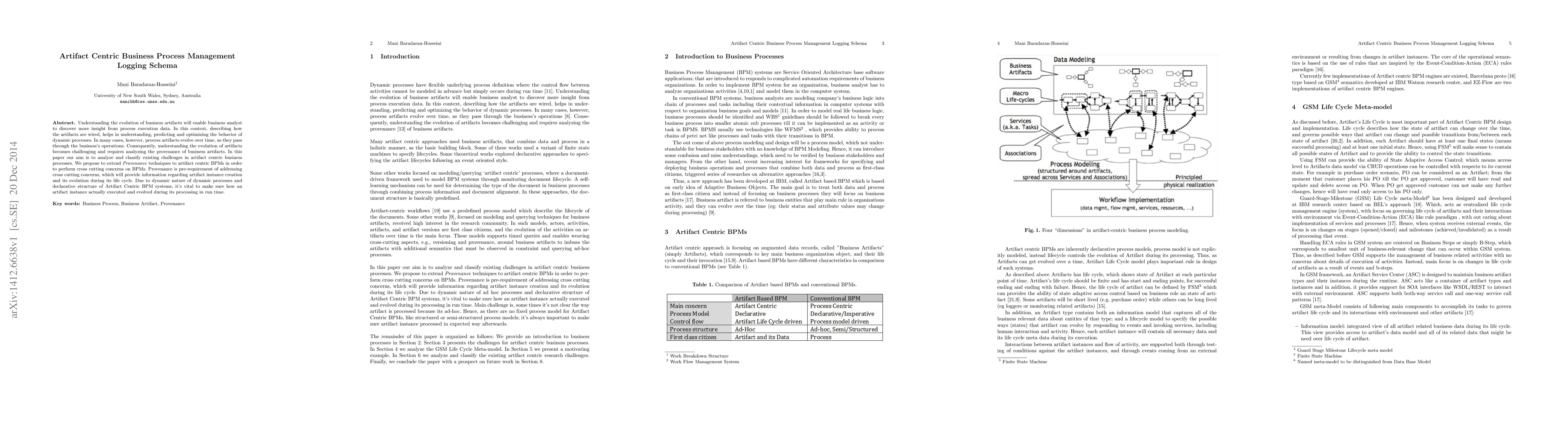 Understanding the evolution of business artifacts will enable business analyst to discover more insight from process execution data. In this context, describing how the artifacts are wired, helps in understanding, predicting and optimizing the behavior of dynamic processes. In many cases, however, process artifacts evolve over time, as they pass through the business's operations. Consequently, understanding the evolution of artifacts becomes challenging and requires analyzing the provenance of business artifacts. In this paper our aim is to analyze and classify existing challenges in artifact centric business processes. We propose to extend Provenance techniques to artifact centric BPMs in order to perform cross cutting concerns on BPMs. Provenance is pre-requirement of addressing cross cutting concerns, which will provide information regarding artifact instance creation and its evolution during its life cycle. Due to dynamic nature of dynamic processes and declarative structure of Artifact Centric BPM systems, it's vital to make sure how an artifact instance actually executed and evolved during its processing in run time.