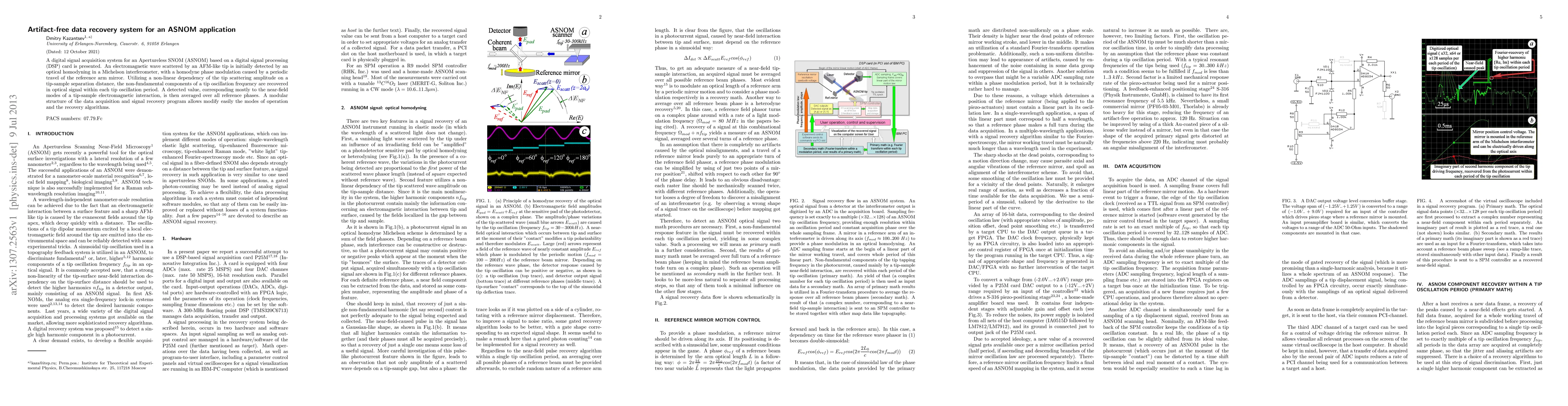 A digital signal acquisition system for an Apertureless SNOM (ASNOM) based on a digital signal processing (DSP) card is presented. An electromagnetic wave scattered by an AFM-like tip is initially detected by an optical homodyning in a Michelson interferometer, with a homodyne phase modulation caused by a periodic travel of the reference arm mirror. Utilizing a non-linear dependency of the tip scattering amplitude on a tip-sample separation distance, the non-fundamental components of a tip oscillation frequency are recovered in optical signal within each tip oscillation period. A detected value, corresponding mostly to the near-field modes of a tip-sample electromagnetic interaction, is then averaged over all reference phases. A modular structure of the data acquisition and signal recovery program allows modify easily the modes of operation and the recovery algorithms.