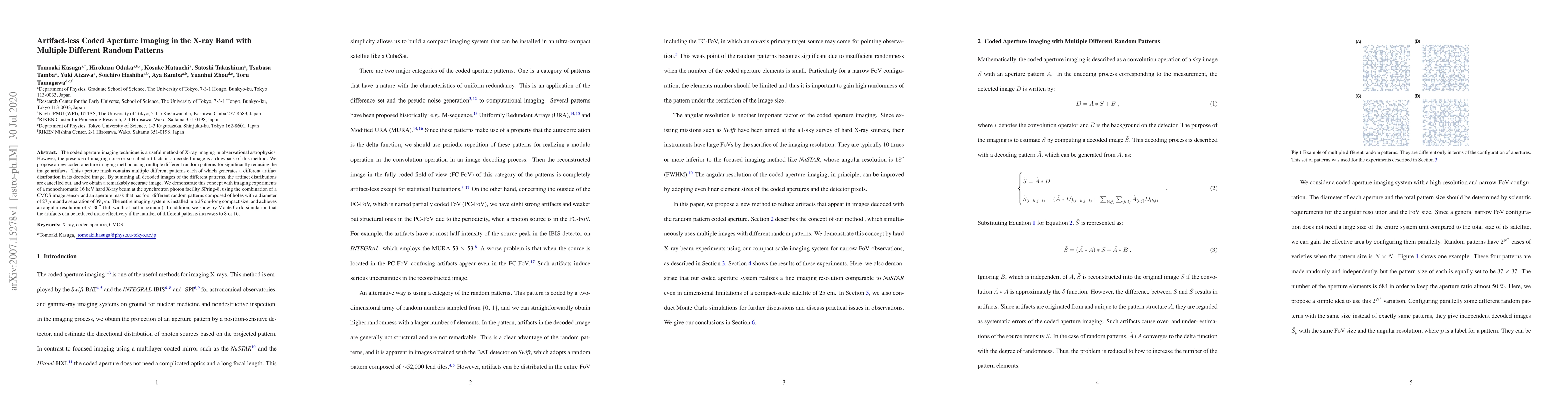 This paper proposes a novel coded aperture imaging technique using multiple random patterns to reduce artifacts in X-ray images, achieving higher accuracy by summing decoded images. Experiments at SPring-8 demonstrate effective artifact reduction and a compact imaging system with an angular resolution of < 30'' FWHM.