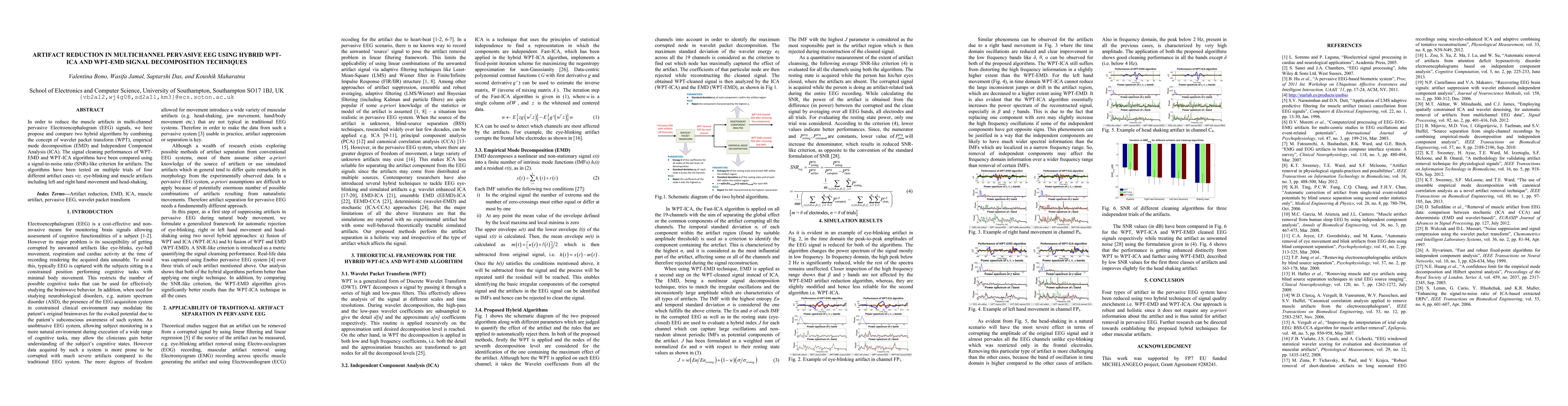 This paper proposes hybrid algorithms combining wavelet packet transform (WPT), empirical mode decomposition (EMD), and Independent Component Analysis (ICA) to reduce muscle artifacts in multi-channel pervasive EEG signals. The performance of WPT-EMD and WPT-ICA is compared using a signal-to-noise ratio criterion, tested on various artifact cases including eye-blinking and hand movements.