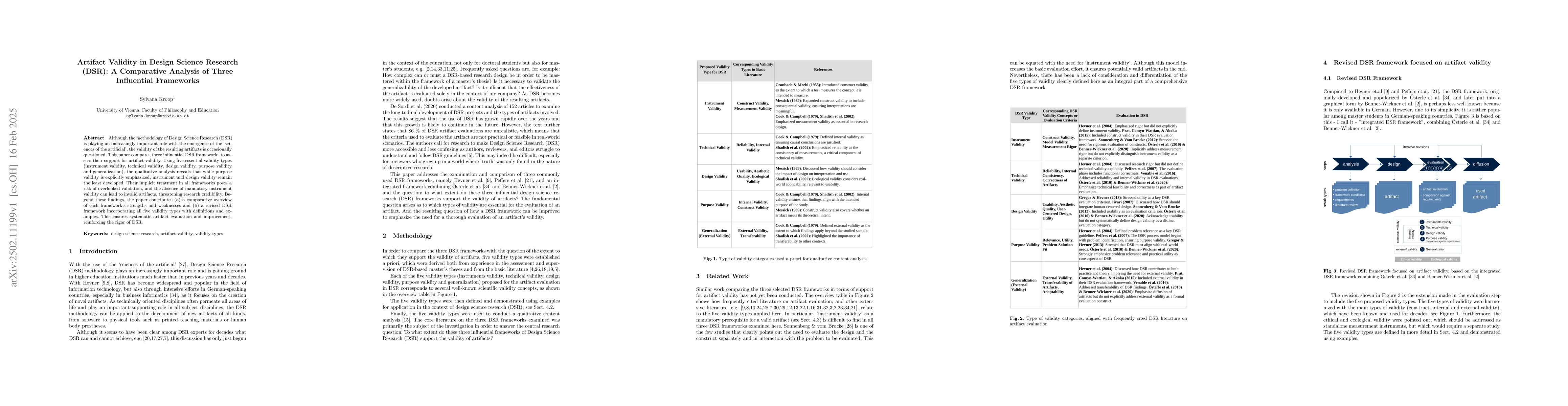 This research compares three influential Design Science Research (DSR) frameworks to assess their support for artifact validity using five essential validity types: instrument validity, technical validity, design validity, purpose validity, and generalization.
