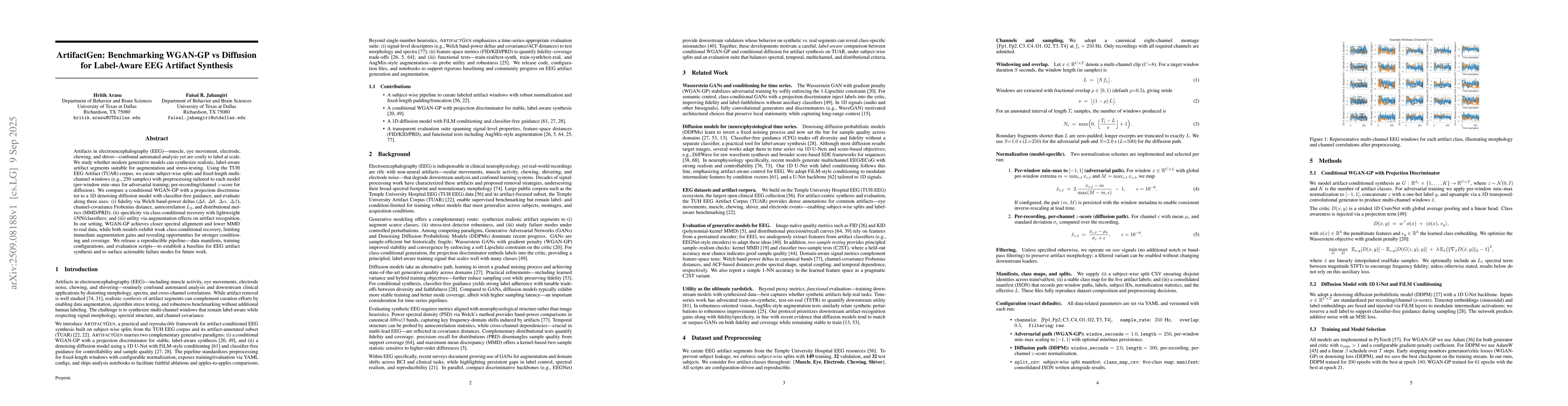 Artifacts in electroencephalography (EEG) -- muscle, eye movement, electrode, chewing, and shiver -- confound automated analysis yet are costly to label at scale. We study whether modern generative models can synthesize realistic, label-aware artifact segments suitable for augmentation and stress-testing. Using the TUH EEG Artifact (TUAR) corpus, we curate subject-wise splits and fixed-length multi-channel windows (e.g., 250 samples) with preprocessing tailored to each model (per-window min-max for adversarial training; per-recording/channel $z$-score for diffusion). We compare a conditional WGAN-GP with a projection discriminator to a 1D denoising diffusion model with classifier-free guidance, and evaluate along three axes: (i) fidelity via Welch band-power deltas ($\Delta\delta,\ \Delta\theta,\ \Delta\alpha,\ \Delta\beta$), channel-covariance Frobenius distance, autocorrelation $L_2$, and distributional metrics (MMD/PRD); (ii) specificity via class-conditional recovery with lightweight $k$NN/classifiers; and (iii) utility via augmentation effects on artifact recognition. In our setting, WGAN-GP achieves closer spectral alignment and lower MMD to real data, while both models exhibit weak class-conditional recovery, limiting immediate augmentation gains and revealing opportunities for stronger conditioning and coverage. We release a reproducible pipeline -- data manifests, training configurations, and evaluation scripts -- to establish a baseline for EEG artifact synthesis and to surface actionable failure modes for future work.