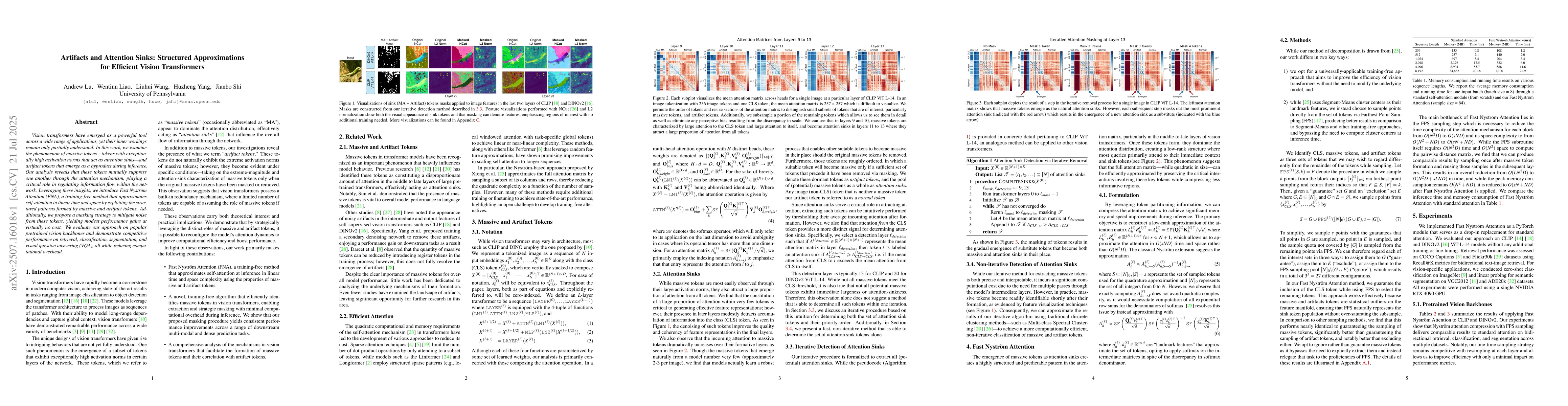 Vision transformers have emerged as a powerful tool across a wide range of applications, yet their inner workings remain only partially understood. In this work, we examine the phenomenon of massive tokens - tokens with exceptionally high activation norms that act as attention sinks - and artifact tokens that emerge as a byproduct during inference. Our analysis reveals that these tokens mutually suppress one another through the attention mechanism, playing a critical role in regulating information flow within the network. Leveraging these insights, we introduce Fast Nystr\"om Attention (FNA), a training-free method that approximates self-attention in linear time and space by exploiting the structured patterns formed by massive and artifact tokens. Additionally, we propose a masking strategy to mitigate noise from these tokens, yielding modest performance gains at virtually no cost. We evaluate our approach on popular pretrained vision backbones and demonstrate competitive performance on retrieval, classification, segmentation, and visual question answering (VQA), all while reducing computational overhead.