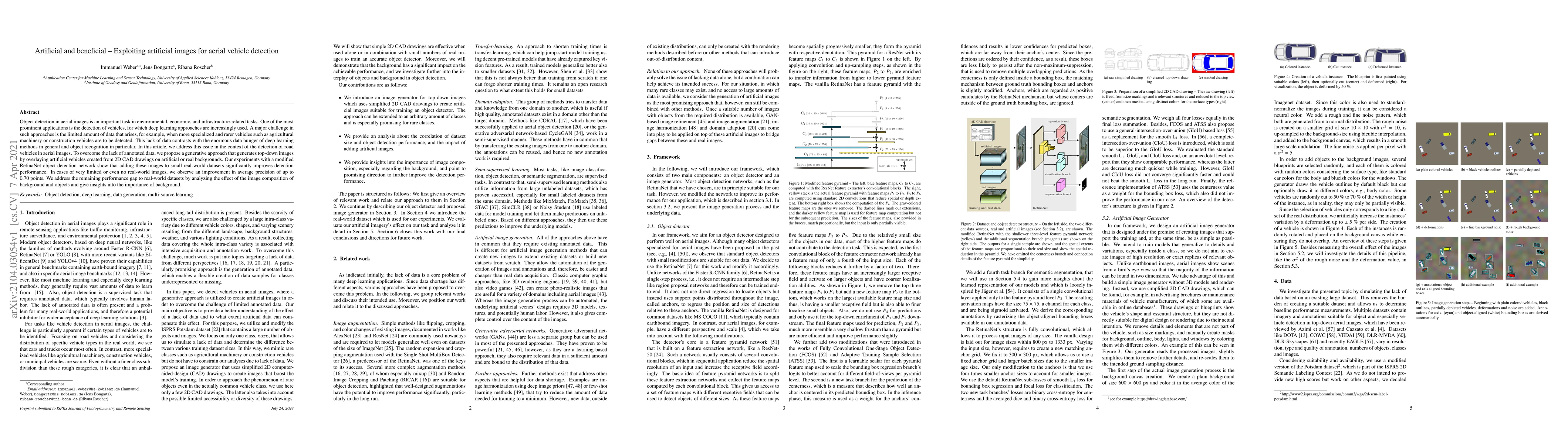 Researchers created artificial images of vehicles to help detect road vehicles in aerial images, improving detection performance on small datasets. Adding these artificial images significantly boosted average precision by up to 0.70 points.