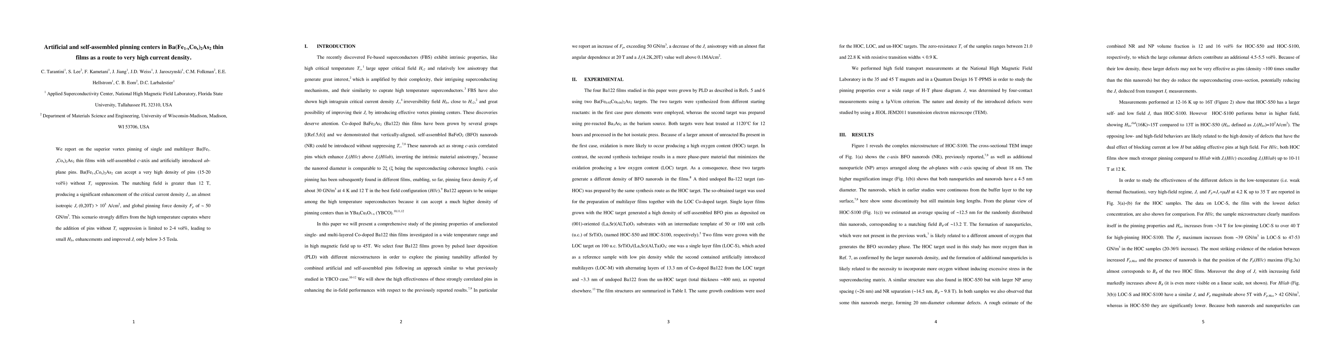 This paper investigates the enhanced vortex pinning in Ba(Fe1-xCox)2As2 thin films with self-assembled and artificially introduced pinning centers, achieving a high critical current density of over 10^5 A/cm^2 and a matching field greater than 12 T, significantly outperforming high-temperature cuprates.