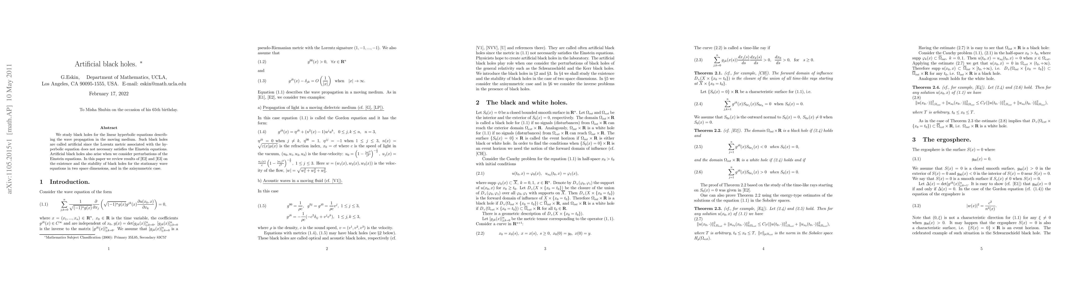 We study black holes for the linear hyperbolic equations describing the wave propagation in the moving medium. Such black holes are called artificial since the Lorentz metric associated with the hyperbolic equation does not necessary satisfies the Einstein equations. Artificial black holes also arise when we consider perturbations of the Einstein equations. In this paper we review author's results of [E2] and [E3] on the existence and the stability of black holes for the stationary wave equations in two space dimensions, and in the axisymmetric case.