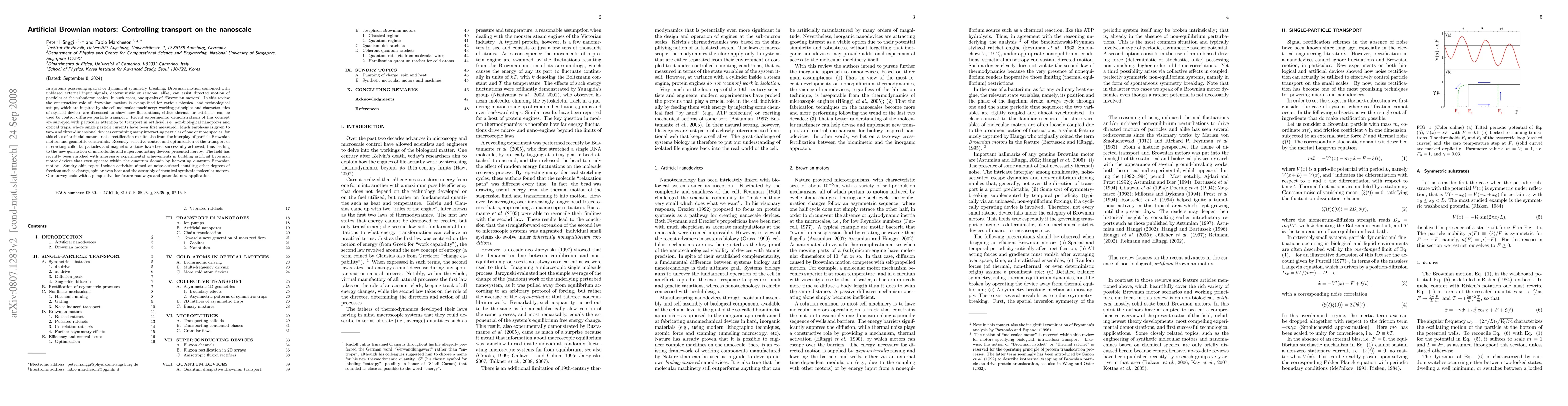 This paper reviews the principles and applications of artificial Brownian motors, demonstrating how controlled Brownian motion can direct particle transport at nanoscales. It highlights recent experimental advances in artificial nanopores and optical traps, emphasizing the role of noise rectification and the optimization of transport in microfluidic and superconducting devices.