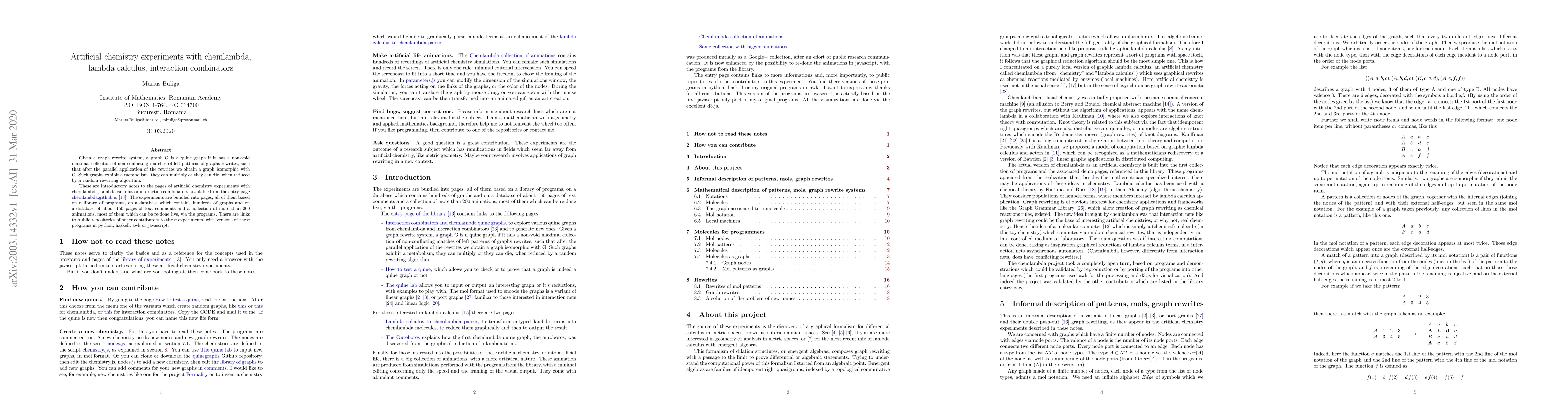 Given a graph rewrite system, a graph G is a quine graph if it has a non-void maximal collection of non-conflicting matches of left patterns of graphs rewrites, such that after the parallel application of the rewrites we obtain a graph isomorphic with G. Such graphs exhibit a metabolism, they can multiply or they can die, when reduced by a random rewriting algorithm. These are introductory notes to the pages of artificial chemistry experiments with chemlambda, lambda calculus or interaction combinators, available from the entry page https://chemlambda.github.io/index.html . The experiments are bundled into pages, all of them based on a library of programs, on a database which contains hundreds of graphs and on a database of about 150 pages of text comments and a collection of more than 200 animations, most of them which can be re-done live, via the programs. There are links to public repositories of other contributors to these experiments, with versions of these programs in python, haskell, awk or javascript.
