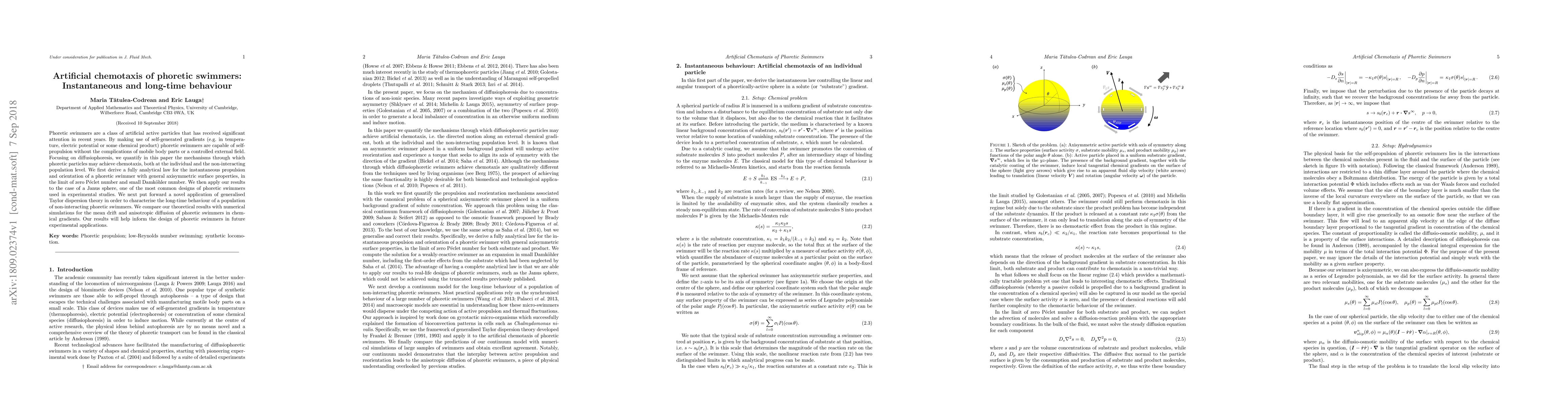 Phoretic swimmers are a class of artificial active particles that has received significant attention in recent years. By making use of self-generated gradients (e.g. in temperature, electric potential or some chemical product) phoretic swimmers are capable of self-propulsion without the complications of mobile body parts or a controlled external field. Focusing on diffusiophoresis, we quantify in this paper the mechanisms through which phoretic particles may achieve chemotaxis, both at the individual and the non-interacting population level. We first derive a fully analytical law for the instantaneous propulsion and orientation of a phoretic swimmer with general axisymmetric surface properties, in the limit of zero P\'{e}clet number and small Damk\"{o}hler number. We then apply our results to the case of a Janus sphere, one of the most common designs of phoretic swimmers used in experimental studies. We next put forward a novel application of generalised Taylor dispersion theory in order to characterise the long-time behaviour of a population of non-interacting phoretic swimmers. We compare our theoretical results with numerical simulations for the mean drift and anisotropic diffusion of phoretic swimmers in chemical gradients. Our results will help inform the design of phoretic swimmers in future experimental applications.