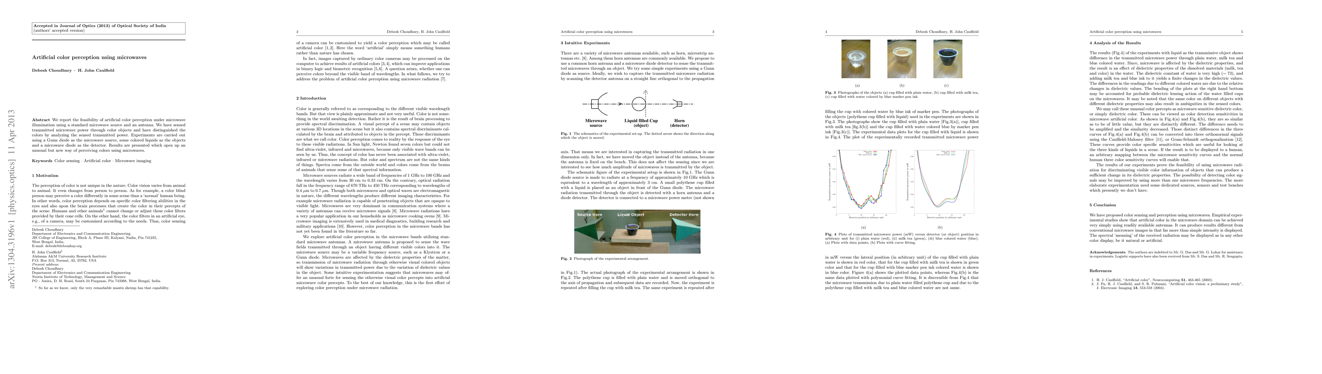 We report the feasibility of artificial color perception under microwave illumination using a standard microwave source and an antenna. We have sensed transmitted microwave power through color objects and have distinguished the colors by analyzing the sensed transmitted power. Experiments are carried out using a Gunn diode as the microwave source, some colored liquids as the objects and a microwave diode as the detector. Results are presented which open up an unusual but new way of perceiving colors using microwaves.