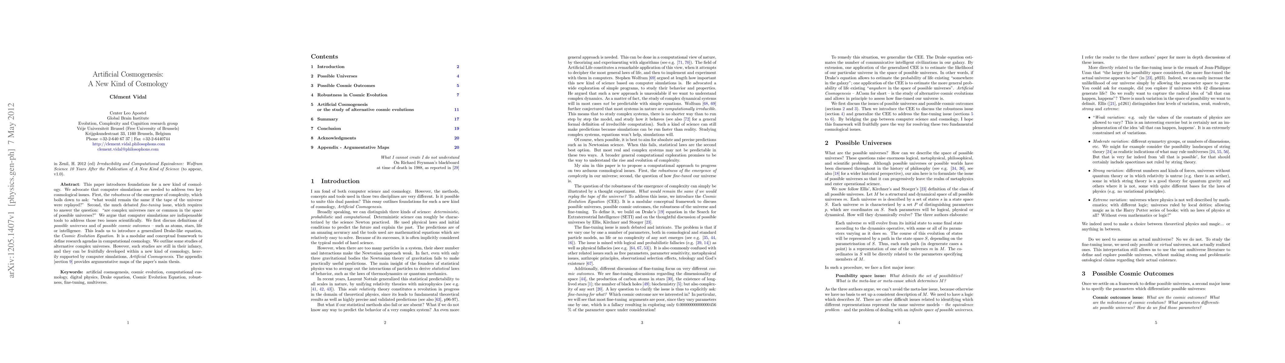 This paper introduces foundations for a new kind of cosmology. We advocate that computer simulations are needed to address two key cosmological issues. First, the robustness of the emergence of complexity, which boils down to ask: "what would remain the same if the tape of the universe were replayed?" Second, the much debated fine-tuning issue, which requires to answer the question: "are complex universes rare or common in the space of possible universes?" We argue that computer simulations are indispensable tools to address those two issues scientifically. We first discuss definitions of possible universes and of possible cosmic outcomes - such as atoms, stars, life or intelligence. This leads us to introduce a generalized Drake-like equation, the Cosmic Evolution Equation. It is a modular and conceptual framework to define research agendas in computational cosmology. We outline some studies of alternative complex universes. However, such studies are still in their infancy, and they can be fruitfully developed within a new kind of cosmology, heavily supported by computer simulations, Artificial Cosmogenesis. The Appendix [section 9] provides argumentative maps of the paper's main thesis. KEYWORDS: artificial cosmogenesis, cosmic evolution, computational cosmology, digital physics, Drake equation, Cosmic Evolution Equation, robustness, fine-tuning, multiverse.