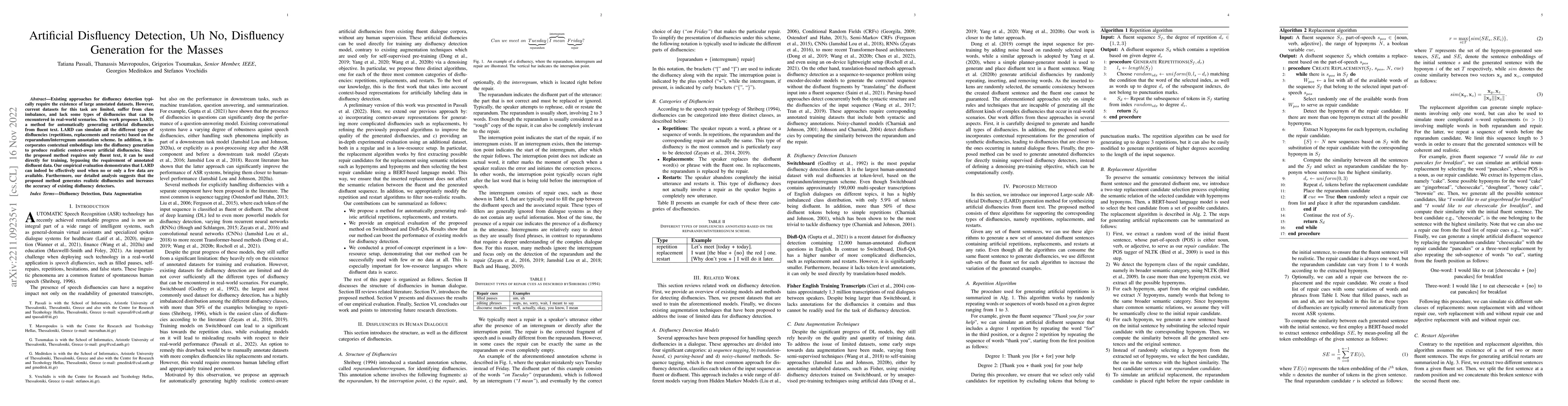 Existing approaches for disfluency detection typically require the existence of large annotated datasets. However, current datasets for this task are limited, suffer from class imbalance, and lack some types of disfluencies that can be encountered in real-world scenarios. This work proposes LARD, a method for automatically generating artificial disfluencies from fluent text. LARD can simulate all the different types of disfluencies (repetitions, replacements and restarts) based on the reparandum/interregnum annotation scheme. In addition, it incorporates contextual embeddings into the disfluency generation to produce realistic context-aware artificial disfluencies. Since the proposed method requires only fluent text, it can be used directly for training, bypassing the requirement of annotated disfluent data. Our empirical evaluation demonstrates that LARD can indeed be effectively used when no or only a few data are available. Furthermore, our detailed analysis suggests that the proposed method generates realistic disfluencies and increases the accuracy of existing disfluency detectors.