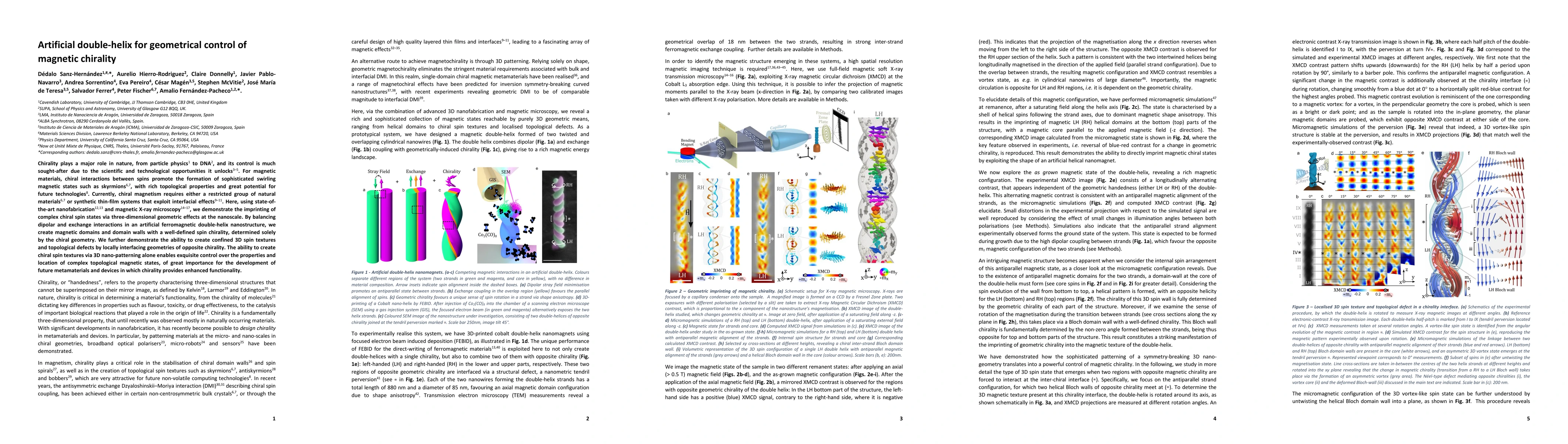 Chirality plays a major role in nature, from particle physics to DNA, and its control is much sought-after due to the scientific and technological opportunities it unlocks. For magnetic materials, chiral interactions between spins promote the formation of sophisticated swirling magnetic states such as skyrmions, with rich topological properties and great potential for future technologies. Currently, chiral magnetism requires either a restricted group of natural materials or synthetic thin-film systems that exploit interfacial effects. Here, using state-of-the-art nanofabrication and magnetic X-ray microscopy, we demonstrate the imprinting of complex chiral spin states via three-dimensional geometric effects at the nanoscale. By balancing dipolar and exchange interactions in an artificial ferromagnetic double-helix nanostructure, we create magnetic domains and domain walls with a well-defined spin chirality, determined solely by the chiral geometry. We further demonstrate the ability to create confined 3D spin textures and topological defects by locally interfacing geometries of opposite chirality. The ability to create chiral spin textures via 3D nano-patterning alone enables exquisite control over the properties and location of complex topological magnetic states, of great importance for the development of future metamaterials and devices in which chirality provides enhanced functionality.