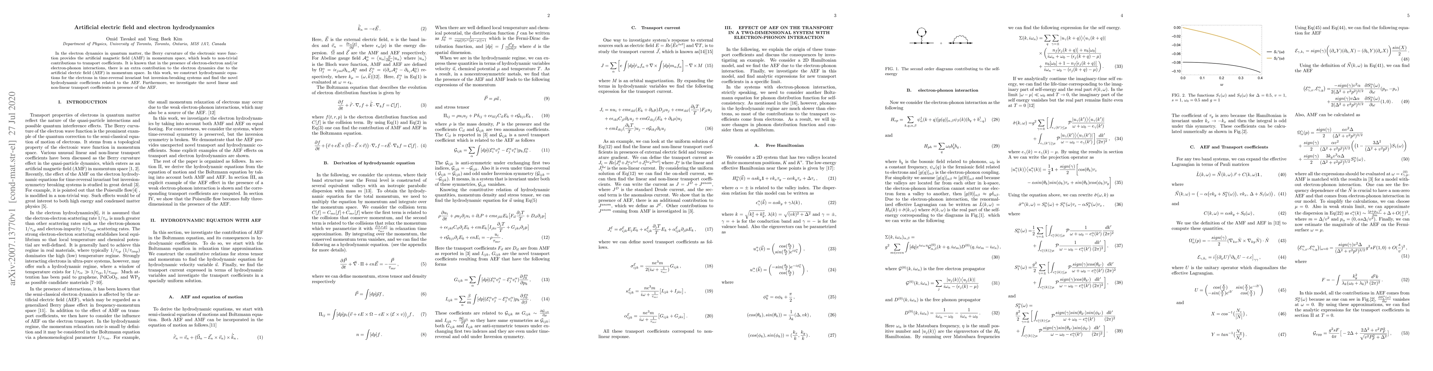 In the electron dynamics in quantum matter, the Berry curvature of the electronic wave function provides the artificial magnetic field (AMF) in momentum space, which leads to non-trivial contributions to transport coefficients. It is known that in the presence of electron-electron and/or electron-phonon interactions, there is an extra contribution to the electron dynamics due to the artificial electric field (AEF) in momentum space. In this work, we construct hydrodynamic equations for the electrons in time-reversal invariant but inversion-breaking systems and find the novel hydrodynamic coefficients related to the AEF. Furthermore, we investigate the novel linear and non-linear transport coefficients in presence of the AEF.