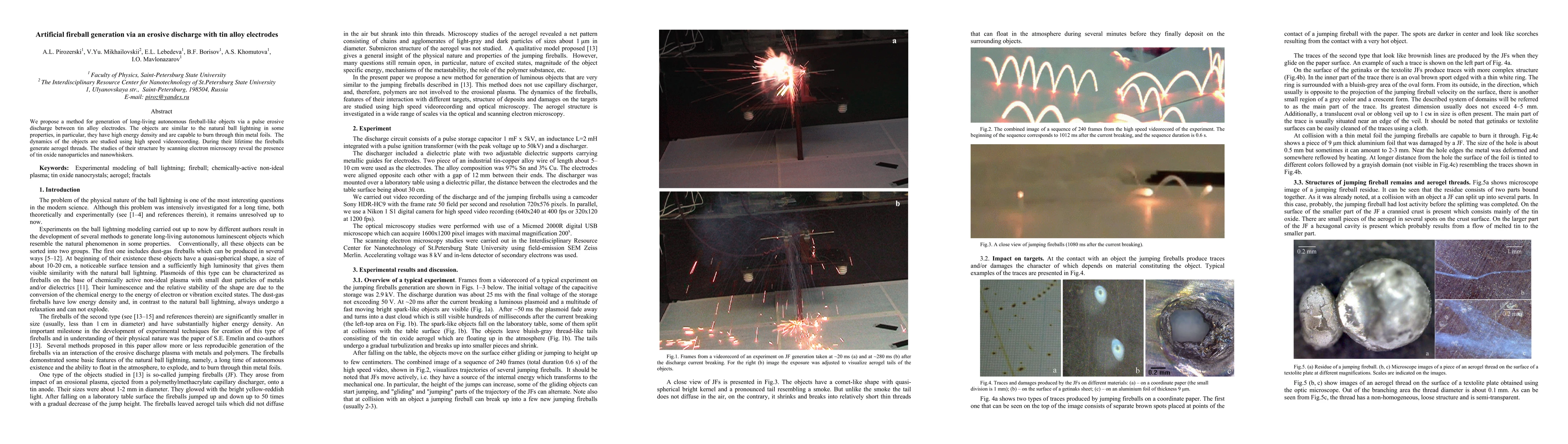 We propose a method for generation of long-living autonomous fireball-like objects via a pulse erosive discharge between tin alloy electrodes. The objects are similar to the natural ball lightning in some properties, in particular, they have high energy density and are capable to burn through thin metal foils. The dynamics of the objects are studied using high speed videorecording. During their lifetime the fireballs generate aerogel threads. The studies of their structure by scanning electron microscopy reveal the presence of tin oxide nanoparticles and nanowhiskers.