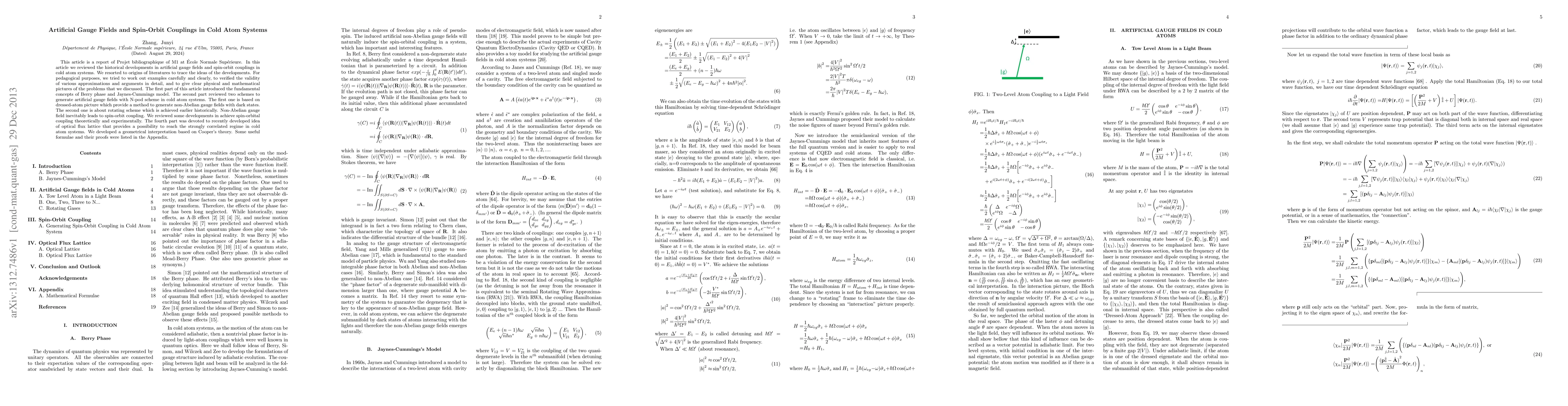 This paper reviews the historical development of artificial gauge fields and spin-orbit couplings in cold atom systems, tracing the origins of literature and detailing pedagogical examples. It covers fundamental concepts like Berry phase and Jaynes-Cummings model, explores methods to generate artificial gauge fields, and discusses the theoretical and experimental advancements in spin-orbit coupling and optical flux lattices.