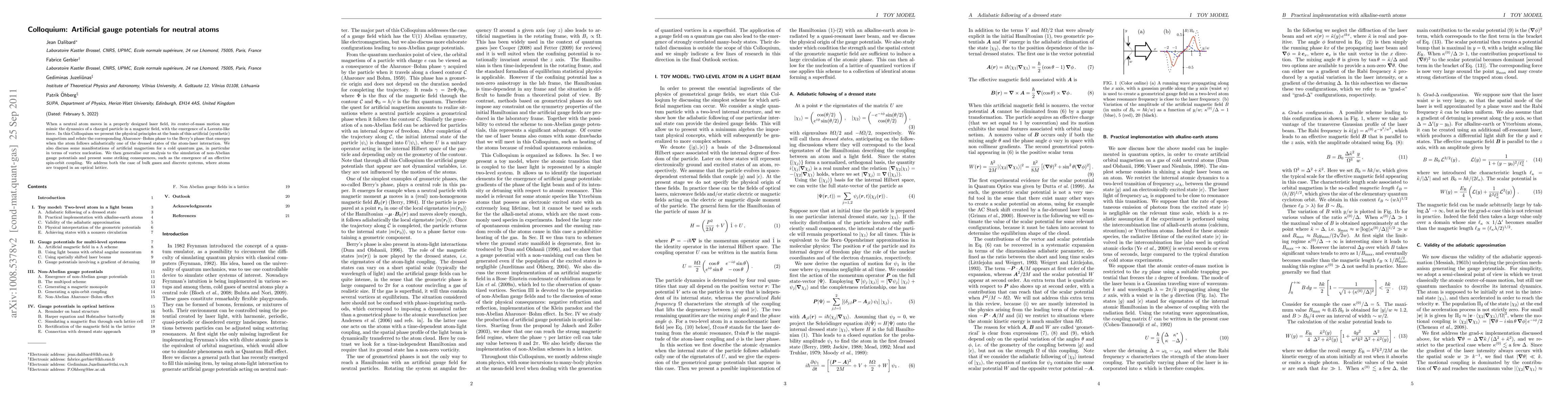 When a neutral atom moves in a properly designed laser field, its center-of-mass motion may mimic the dynamics of a charged particle in a magnetic field, with the emergence of a Lorentz-like force. In this Colloquium we present the physical principles at the basis of this artificial (synthetic) magnetism and relate the corresponding Aharonov-Bohm phase to the Berry's phase that emerges when the atom follows adiabatically one of its dressed states. We also discuss some manifestations of artificial magnetism for a cold quantum gas, in particular in terms of vortex nucleation. We then generalise our analysis to the simulation of non-Abelian gauge potentials and present some striking consequences, such as the emergence of an effective spin-orbit coupling. We address both the case of bulk gases and discrete systems, where atoms are trapped in an optical lattice.