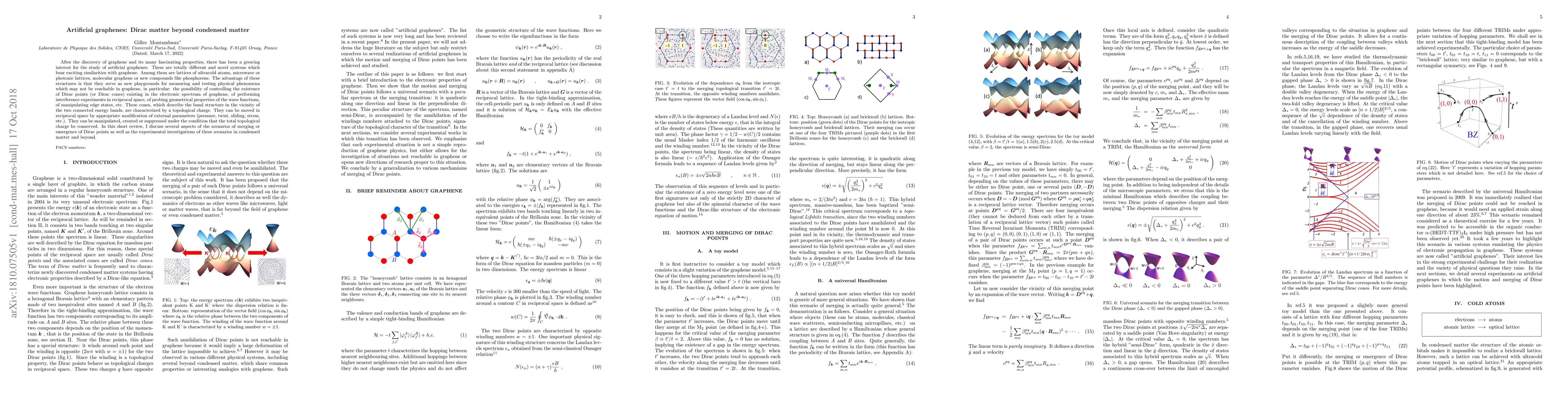 After the discovery of graphene and its many fascinating properties, there has been a growing interest for the study of "artificial graphenes". These are totally different and novel systems which bear exciting similarities with graphene. Among them are lattices of ultracold atoms, microwave or photonic lattices, "molecular graphene" or new compounds like phosphorene. The advantage of these structures is that they serve as new playgrounds for measuring and testing physical phenomena which may not be reachable in graphene, in particular: the possibility of controlling the existence of Dirac points (or Dirac cones) existing in the electronic spectrum of graphene, of performing interference experiments in reciprocal space, of probing geometrical properties of the wave functions, of manipulating edge states, etc. These cones, which describe the band structure in the vicinity of the two connected energy bands, are characterized by a topological "charge". They can be moved in reciprocal space by appropriate modification of external parameters (pressure, twist, sliding, stress, etc.). They can be manipulated, created or suppressed under the condition that the total topological charge be conserved. In this short review, I discuss several aspects of the scenarios of merging or emergence of Dirac points as well as the experimental investigations of these scenarios in condensed matter and beyond.