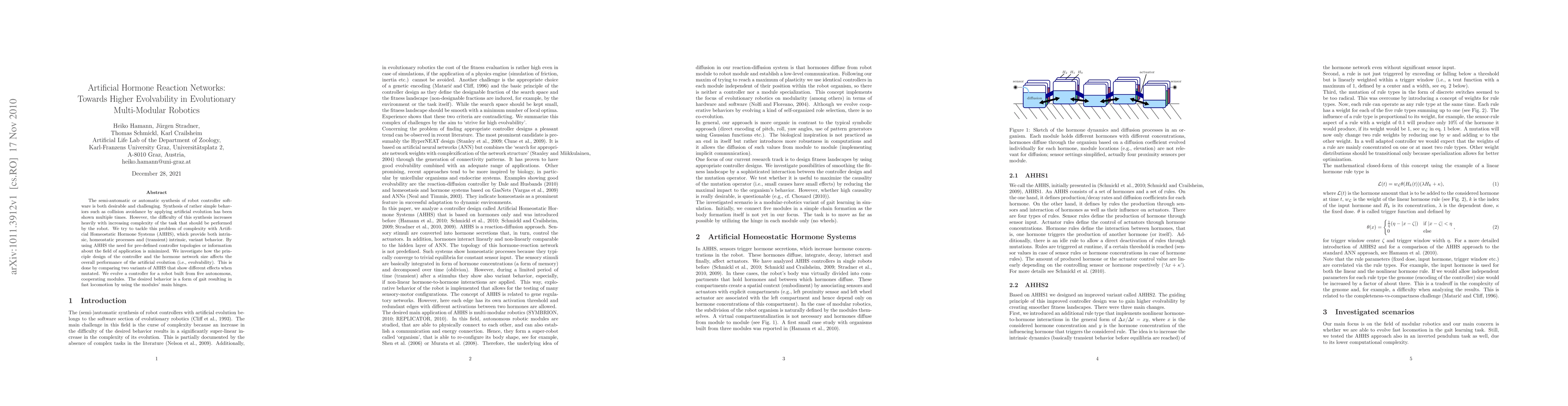 The semi-automatic or automatic synthesis of robot controller software is both desirable and challenging. Synthesis of rather simple behaviors such as collision avoidance by applying artificial evolution has been shown multiple times. However, the difficulty of this synthesis increases heavily with increasing complexity of the task that should be performed by the robot. We try to tackle this problem of complexity with Artificial Homeostatic Hormone Systems (AHHS), which provide both intrinsic, homeostatic processes and (transient) intrinsic, variant behavior. By using AHHS the need for pre-defined controller topologies or information about the field of application is minimized. We investigate how the principle design of the controller and the hormone network size affects the overall performance of the artificial evolution (i.e., evolvability). This is done by comparing two variants of AHHS that show different effects when mutated. We evolve a controller for a robot built from five autonomous, cooperating modules. The desired behavior is a form of gait resulting in fast locomotion by using the modules' main hinges.