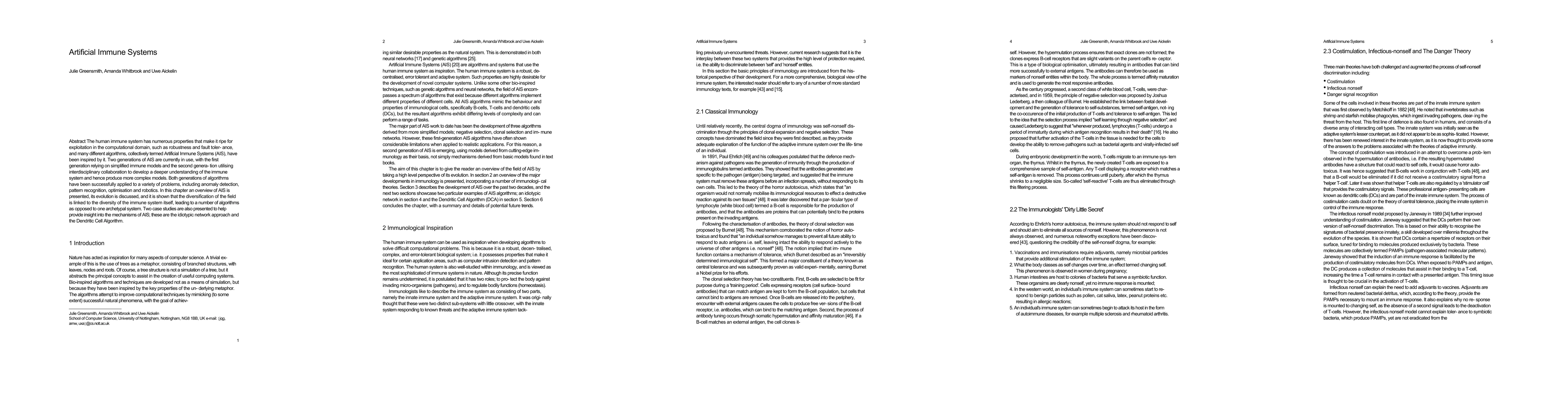 This paper provides an overview of Artificial Immune Systems (AIS), detailing their evolution from simplified models to more complex, interdisciplinary approaches inspired by the human immune system. It highlights the successful applications of AIS in anomaly detection, pattern recognition, optimization, and robotics, and presents case studies on the idiotypic network approach and the Dendritic Cell Algorithm.