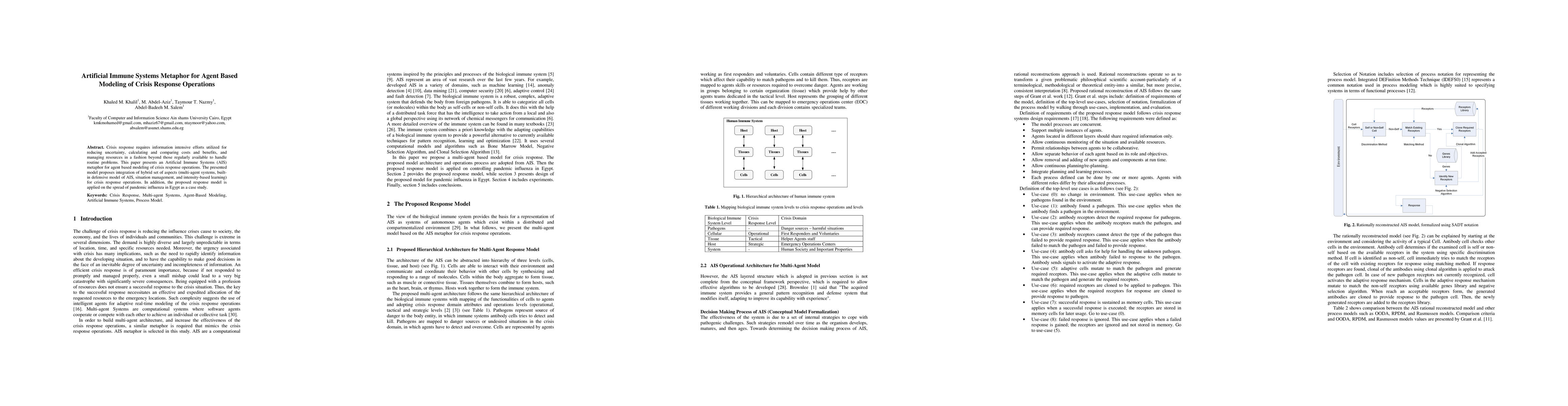 This paper introduces an Artificial Immune Systems (AIS) metaphor for agent-based modeling of crisis response operations, integrating multi-agent systems, AIS defensive models, and intensity-based learning. The model is demonstrated through a case study on the spread of pandemic influenza in Egypt.